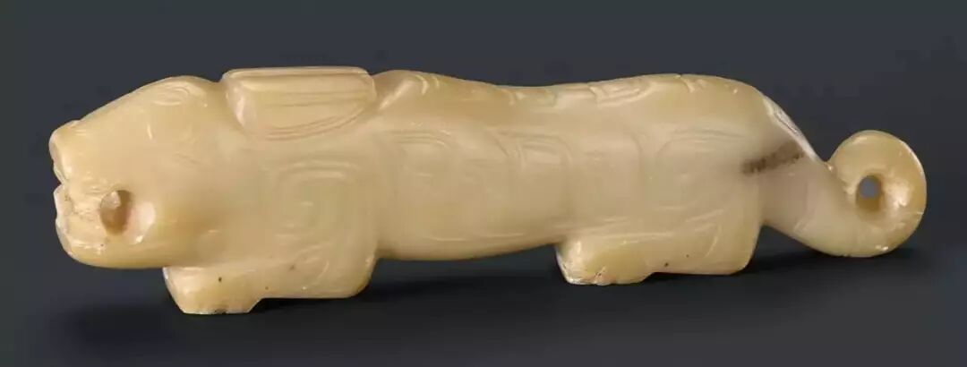 虎为百兽之君,早在新石器时代即开始被人神化。仰绍文化墓地内发现以蚌堆砌的龙、虎造型,说明虎和龙同为人们崇拜的神兽。本器以双阴刻线加大斜刀手法装饰,具有浅浮雕效果的纹样,亦使虎之威猛神气赫然而生。![]()
