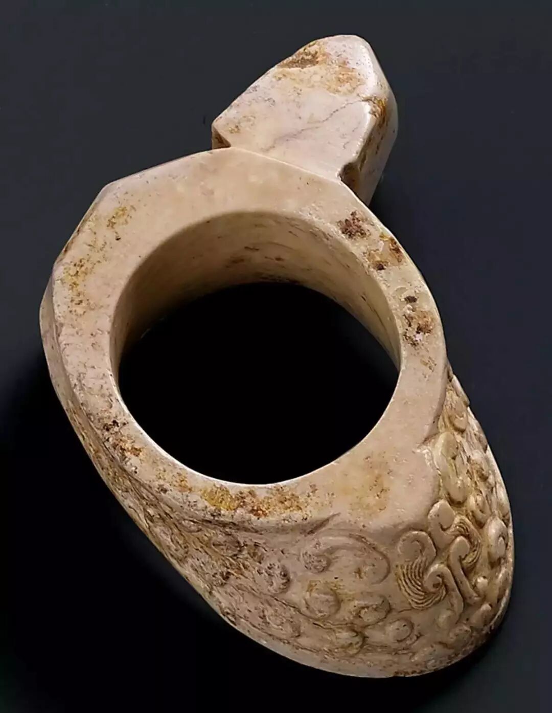 春秋战国时期,韘极为流行。然春秋战国时期玉韘有一明显特徵,即因形制短矮无法容纳勾弓弦的横向凹槽,另外表面雕有纹饰。此反映出玉韘已不能用钩弦和套在拇指上,仅仅是作为佩戴于身上之装饰品。![]()