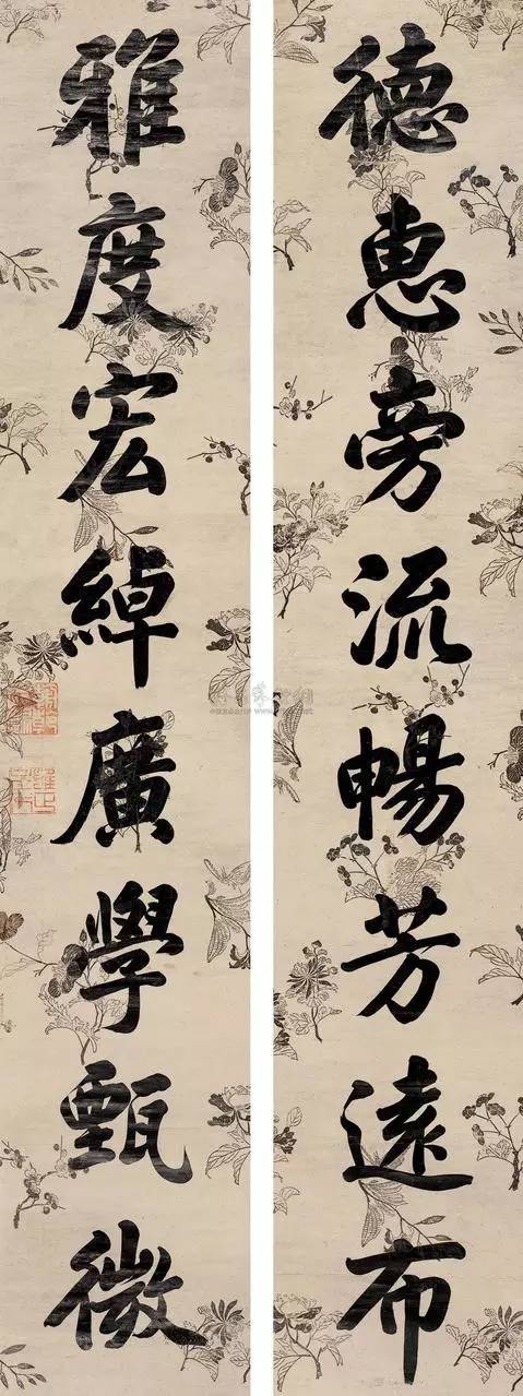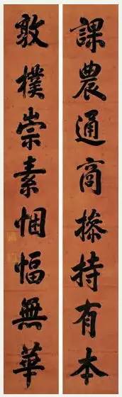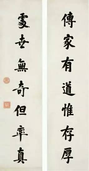 清代诸帝皆长於书法,这首先得力於严格的文化教育传统。在书法风格上,从康熙、雍正、乾隆直到嘉庆,其间有一脉相承之处,大概都不处於董其昌、赵孟頫的范围。嘉庆皇帝也是如此。其书法之用笔结体,都与乃父非常类似,但缺乏乾隆皇帝的潇洒奔放,稍显拘谨。这大概是个人天赋及用功程度不同的原因。道光皇帝是清代唯一一位以嫡长子身份即位的皇帝。道光皇帝恪勤於治,万机之余,亦以书画自娱。从下面书法对联看,其书法於颜鲁公用力甚多,复用力於虞世南、赵松雪等松秀一路,结体开阔端庄,点画凝重浑厚,气象静穆,自有一种富贵雍容之度。咸丰,全名爱新觉罗·奕詝,道光帝第四子,是清朝公元1644年入关后的第七位皇帝,也是清朝第九位皇帝,20岁时登基,是清朝最后一位通过秘密立储制继承皇位的皇帝,与同治皇帝为父子关系,与光绪皇帝是叔侄关系。咸丰皇帝在位时间不常,但其汉文化修养一如其父祖。书法醇厚端庄,不急不躁,自有一种皇家富贵雍容之气充溢其中,为臣子者不能写得出来。
