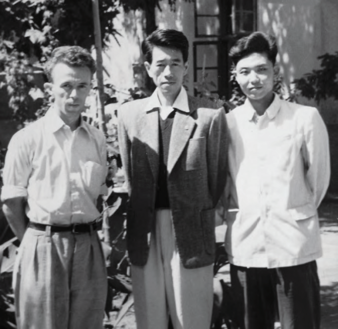 1956年,王逊担任国家十二年科学发展规划美术学科召集人,1957年正式创建了中国第一个美术史系——中央美术学院美术史系。从此,拥有悠久历史和丰厚传统的中国美术史研究开始了正规化的人才培养。因在哲学、美学、美术理论、美术史与考古、敦煌学、工艺美术、民间美术等多个领域都卓有建树,王逊成为了修养全面、融通学理、综合创造的典范。他把学问作用于现实,将学术理想与新社会文化建设相结合。当时任其助教的薄松年曾分享先生上课的特色:“王逊先生是真正研究中国美术的全史,从原始社会开始……他讲得非常生动、非常形象,而且理论非常强……他讲的内容放到现在仍是高水平的。”王逊(左二)与捷克留学生海兹拉尔、助教薄松年合影