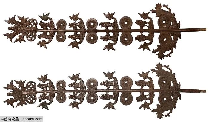 杭州宜和2022年夏拍-金银锭/机制币/古钱,清川炉大型花钱母钱钱树一对,字口犀利,地章细腻,形体硕大,造型优美,最上端金钱祥云之上四蝠环绕一骑鹤仙人,寓意极其吉祥,赵权之经典旧藏,125万落槌,含佣143.75万成交,原插放于神庙中神龛左右。
