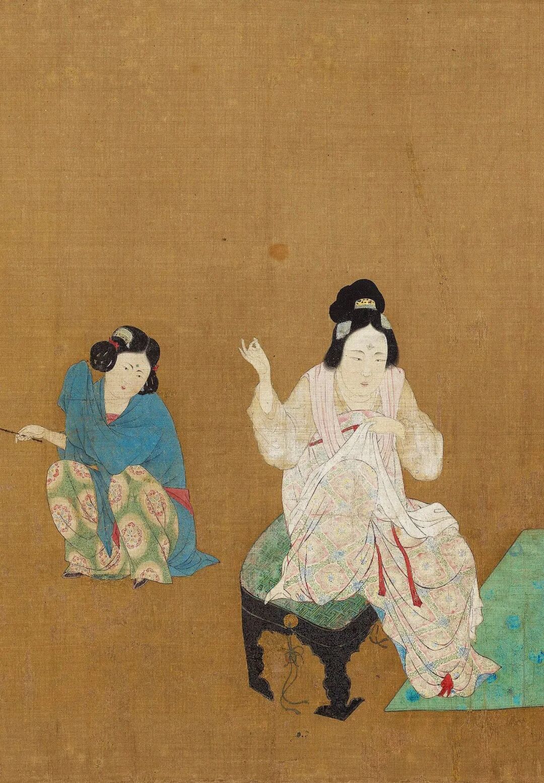 《槐荫消夏图》 宋 佚名 小品册页,纸本设色,北京故宫博物院藏它不仅在画面形象、结构上有明显进步,而且在人物的个性特征刻画、细节刻画、画面设色、构图形式、表现手法等方面都有了重大突破,形成了整体特色。宋代的郭若虚曾在《图画见闻志》中评价唐和宋初的人物画只是停留于表现外表。作品中人物大多面相丰腺、形貌秀丽、文雅高贵,身躯比例适度而缺乏了对内心世界的刻画。这一系列的外貌特征都迎合了当时人们的审美和喜好,从而出现了工笔人物画人物形象类同化的现象。所以,宋代中后期的大批人物画,都更加注重对人物的个性特征和内心的刻画。