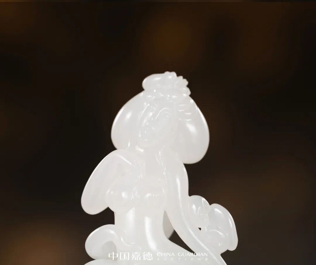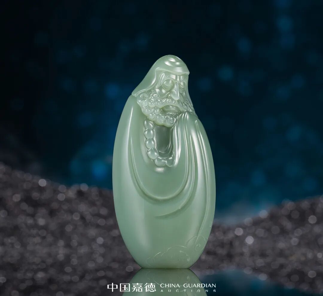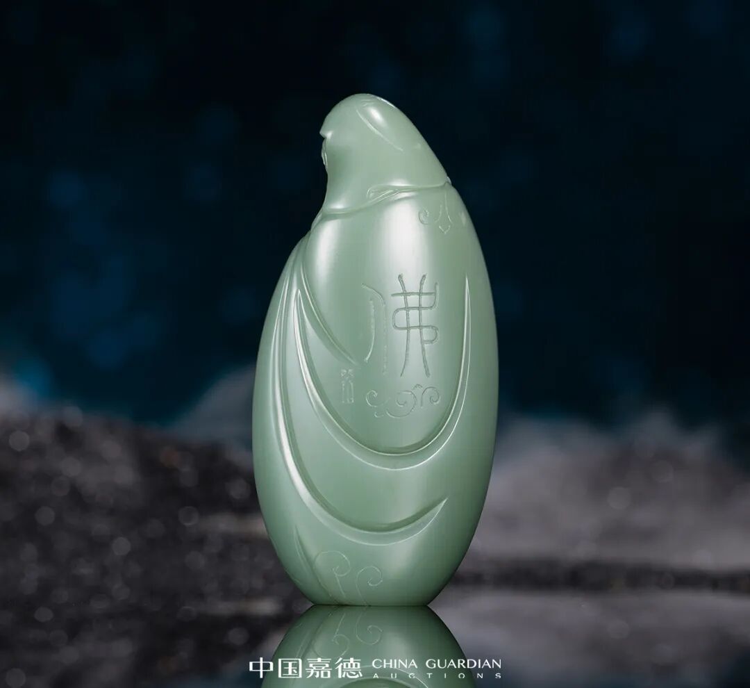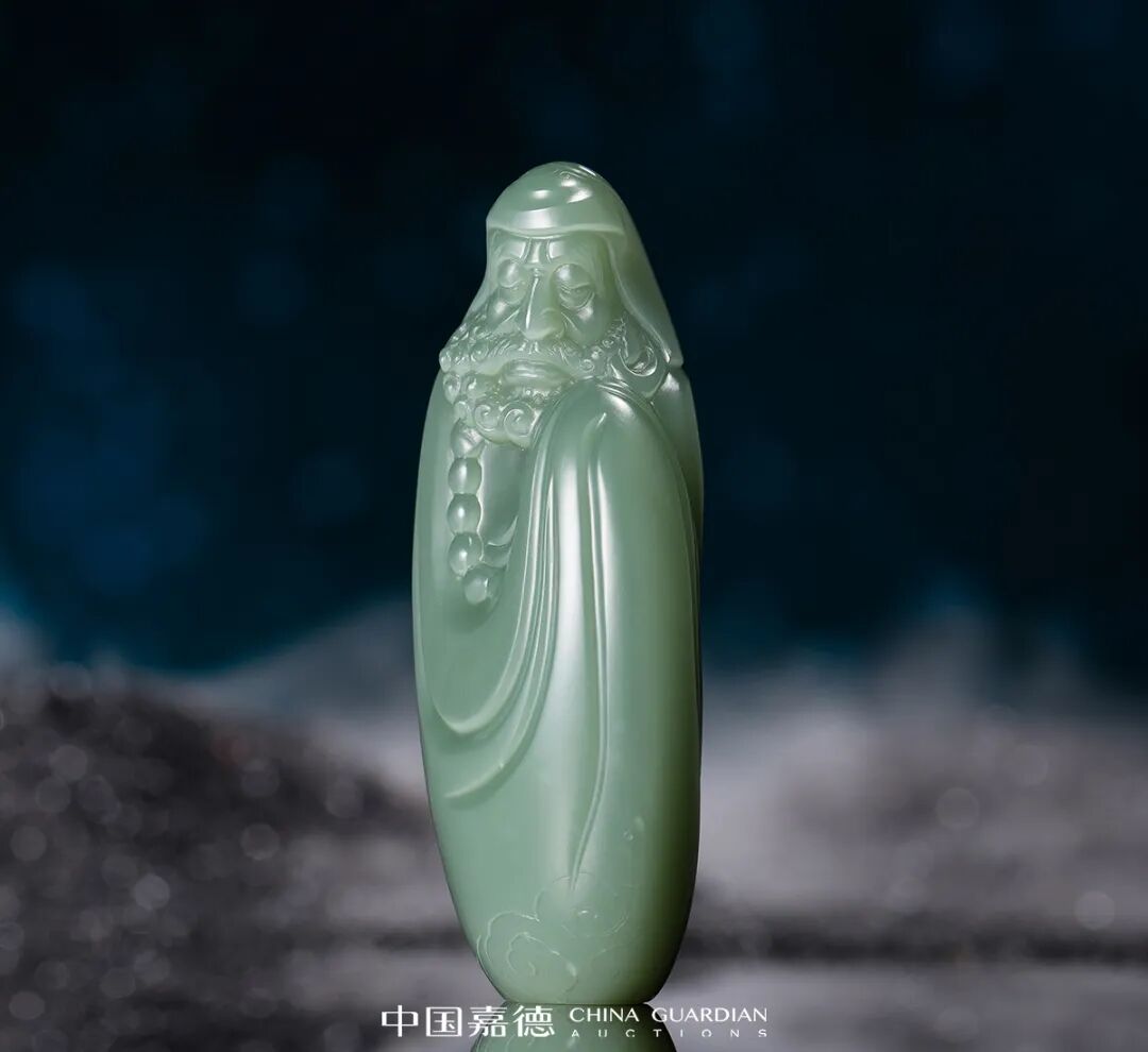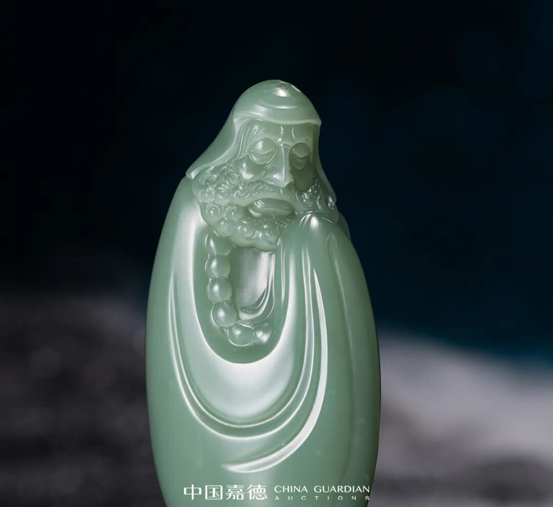 材质白细油润,以虚实结合的表现手法,刻画真龙吐水、行云布雨,正所谓“遇水则发”,画面生动威武,寓意吉祥。作者:林光,中国玉石雕刻大师,擅长于人物、动物、仿古和花鸟等作品的雕刻工艺。林光所作特点鲜明,能发挥工匠之学,玉石之美,将古之韵律与大自然的浑然天成合为一体,内涵至深,独具功夫。此件作品为碧玉所雕达摩摆件,玉质温润细腻,结构均匀,油润度佳,颜色为纯正的鸭蛋青。作者为中国玉石雕刻大师杨文双,极擅长人物形象刻画,尤以达摩形象最为传神,雕刻的达摩双目微闭,胸口带佛珠,佛珠颗颗圆润饱满,身披袈裟,祥云纹环绕达摩周身,达摩面部雕刻精细,毛发纤毫毕现,身体部分则用简单的线条刻画,留有大片的留白,整件作品简繁结合重点突出,实属佳品。此件作品为青玉所雕笔洗,玉质温润细腻,结构均匀,油润度佳。整件作品雕琢成池塘形状,侧身雕刻小鱼戏莲,活泼可爱,笔洗边缘雕刻为波浪形状,线条圆润平滑。底部落有款识:茹月峰。整件作品胎薄,器型饱满,圆润可爱,无论是使用还是观赏都十分适宜。茹月峰,中国玉石雕刻大师,高级工艺美术师,主攻雕刻薄胎器皿作品,在薄胎器皿的造型款式、纹理图案、刀法等难题的攻关上,颇多建树。大胆将国画的笔墨趣味通过对玉胎薄厚精准掌控的方式呈现在薄胎器皿上,形成独具个人风格的“水墨薄胎器皿”。达摩玛瑙勒子,为《幻象》系列作品之一。选材玛瑙,质地温润,以褐、白、深红撞色为主,层次分明干净,极似天眼,背面则带有墨绿色,分布如水墨晕染,色彩对比强烈,神秘玄妙,极具视觉冲击力!作者运用压低浮雕技法,精琢达摩面壁悟道,庄严非凡。人物形象刻画生动,意境深远,极富神韵。整体型制圆润饱满,十分适合收藏佩戴。可定制项坠款、手持款、108长链款。款识:石李文卓,中国玉石雕刻大师,北派玉雕新锐,擅长玛瑙类雕刻,其创意与俏色独具风格。“玉贵人”谐音“遇贵人”。裸女与罗汉是中国工艺美术大师吴德昇最著名的两种风格之作,极受藏家喜爱。吴德昇,中国工艺美术大师,中国玉石雕刻大师,1961年出生于上海。当代玉雕“罗汉三杰”之一,在玉器的工艺设计上有自身独创的理念,特别在传统的玉雕观念中,融合了西方雕塑的精华,力求摆脱平庸,追求新奇,作品给人以直觉的美;在创作思路上,人物变形略显夸张,使人感到中国传统艺术魅力就在于线条特有的审美价值和高度的形式美感,巧妙地把传统和现代风格结合在一起,形成自己独特的玉雕艺术风格。竞拍成交赠送《中国玉石雕刻大师系列丛书——“卓而大雅”吴德昇卷》