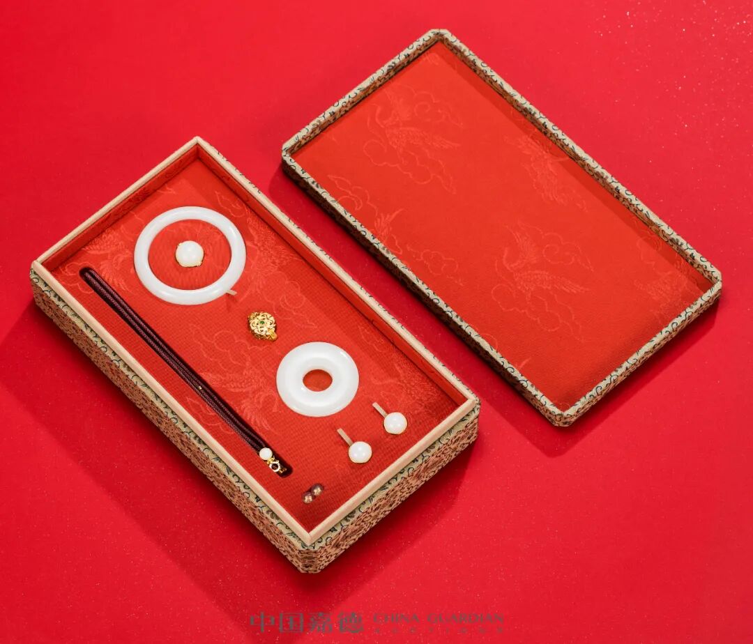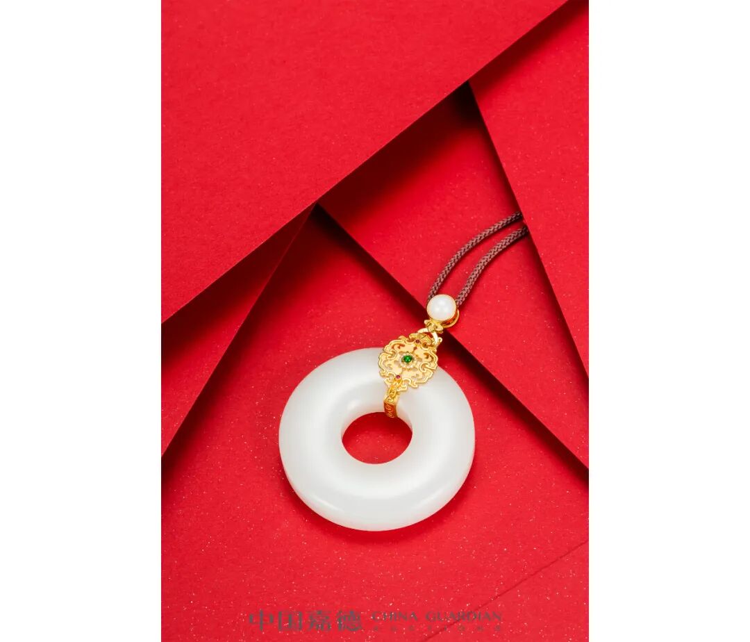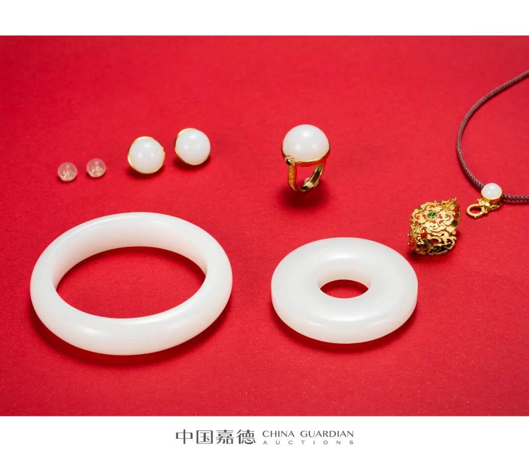 玉牌由优质白玉籽料雕琢而成,质地细腻油润,脂白无瑕,大片保留原皮,皮色淡金,局部聚红,色彩雅致。作者以皮俏色巧雕一只金色猛虎,玉肉处雕琢威武的神龙,写实与写意风格结合,虚实相生。背面设计为流云缝隙中露出的谷纹,谷纹是古代玉璧常用纹样,朴拙神秘,古雅大方。葛洪,中国玉石雕刻大师,苏州市市级非物质文化遗产项目“苏州玉雕”代表性传承人。早年求学于苏州工艺美术学校,1987年入苏州玉雕厂,2003年创建葛洪玉雕工作室。其作品以苏州小型山子及仿古件作品为长,尤善战汉风格,以情带意,出古入新,将艺术的匠心与美玉的天成融为一体,其作品内涵丰沛,清新自然,颇具文人画意,兼具园林之妙,盈寸天地,山朗水阔,别有气象。竞拍成交赠送《中国玉石雕刻大师系列丛书——“德承洪范”葛洪卷》当代 和田玉吉瑞首饰套组:手镯、平安扣挂件、戒指、耳环一对手镯内径:57 mm 72g 平安扣:5.5×5.5 cm 65g 耳钉:1.5×1.5 cm 7g;戒指:2 cm 内径17 mm 11g此套和田玉精工首饰,含手镯、平安扣挂件、戒指各一件,耳环一对。整套作品玉质温润细腻,洁白莹润无杂质。手镯为泥鳅背,圈口大小适中,线条平直,平安扣圆润饱满,配金扣一个与绳结一条可佩戴,戒面、耳环面圆润,适宜佩戴。整套作品风格统一,寓意吉祥,另附锦盒,十分适宜作为礼品相赠。