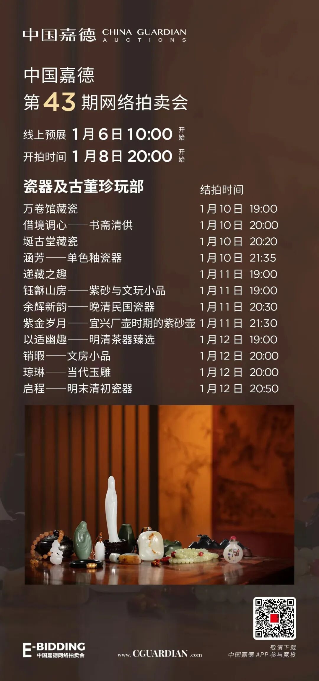 ●请您于参与拍卖活动当日24小时前完成账户注册并交纳保证金。时间:2023年1月6日至13日10:00–18:00地点:嘉德艺术中心B2层(北京市东城区王府井大街1号)。●中国嘉德为竞买人提供查看拍卖标的实物的条件,务请竞买人亲自审看。本公司对拍卖标的不承担瑕疵担保责任。请拨打1501000622015910807786转分机9![]()