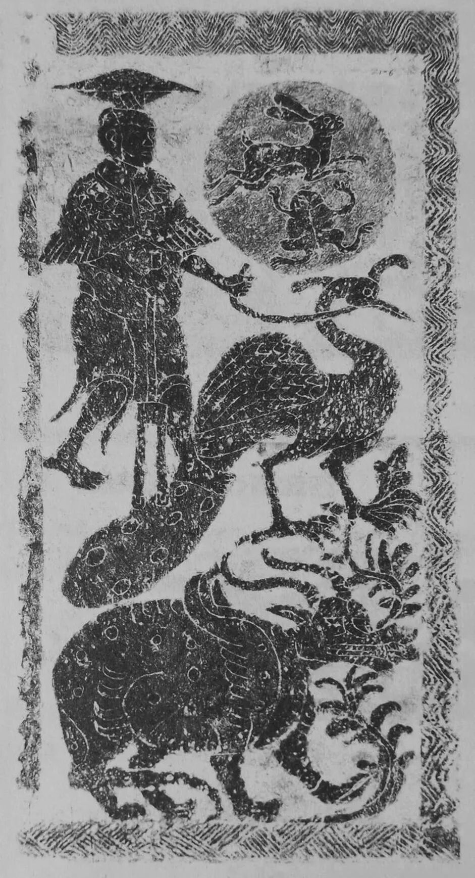 不过,汉代画像艺术中的捣药兔并不是单纯出现在月宫中,更非嫦娥仙女的小宠物。它们既有单独出现,也有作为瑞兽之一出现在升仙题材的画面中,还有时候陪伴在西王母身边,甚至一度成为辨识西王母的重要图像,如同西方圣母身旁的小天使,成为经典的组合图像。