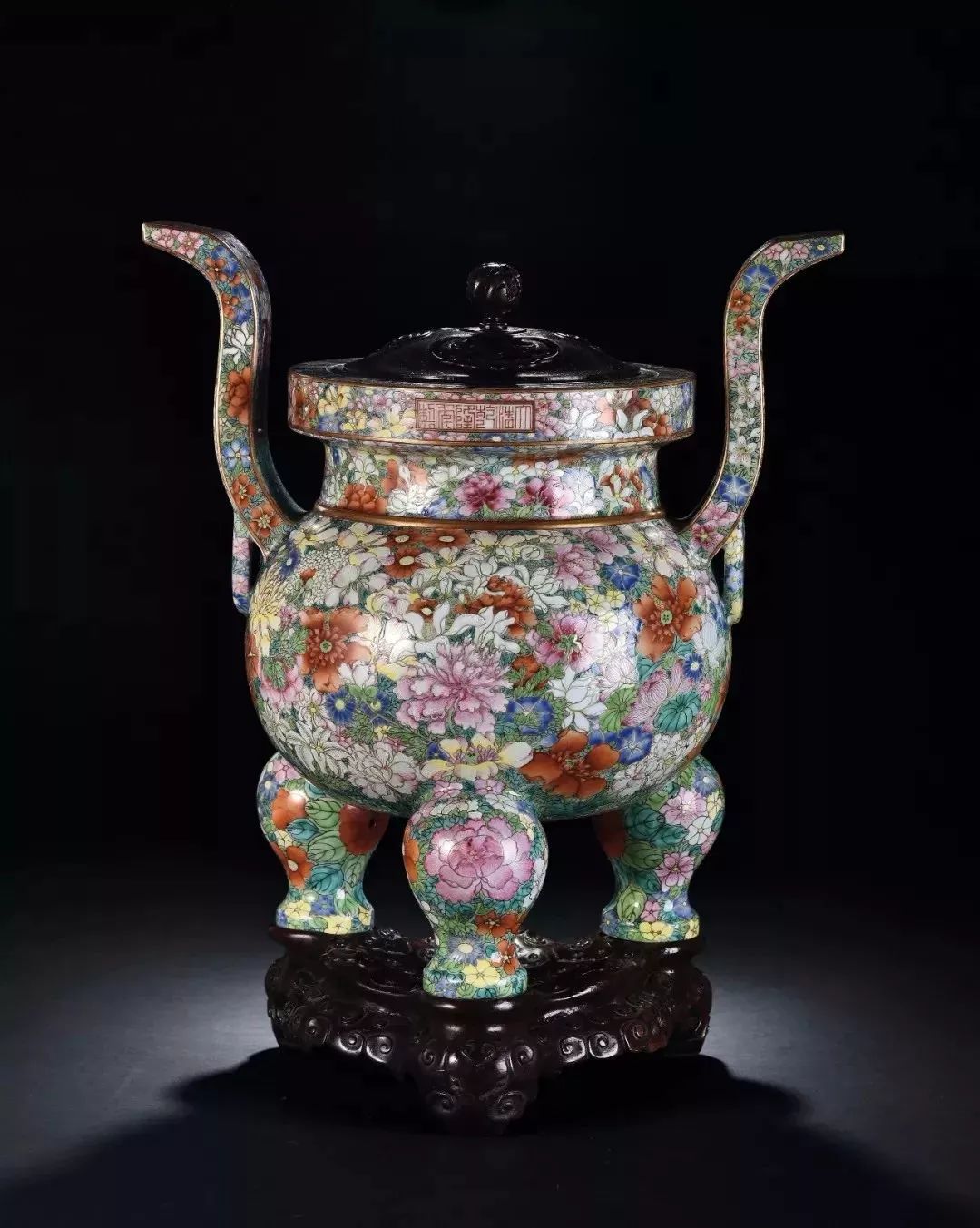 清乾隆 粉彩百花不落地朝冠耳三足炉