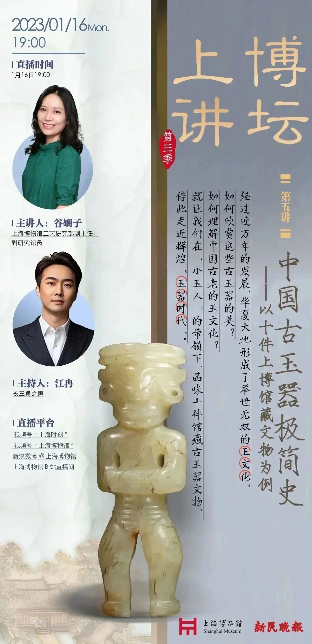 本期上博讲坛拟借十件馆藏古玉器文物,在上博“小玉人”的带领下,依自古至今的时间顺序通览中国古玉器极简史,并稍重笔墨,结合主讲人国家课题的研究成果,以长三角地区的良渚文化为切入点,普及强调中国玉器发展史上最辉煌却最不为普通民众所了解的时期——“玉器时代”。