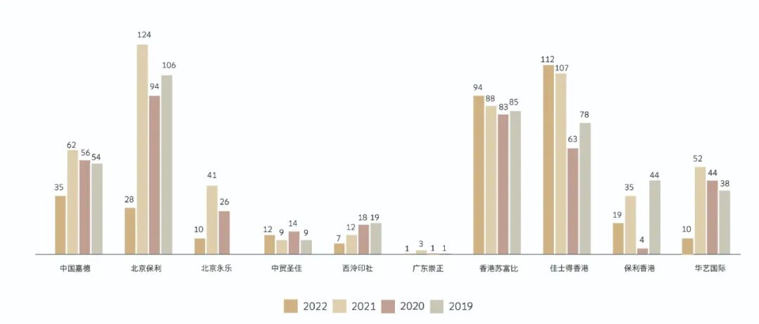 主要拍企2019—2022春秋大拍成交额情况 (单位:亿元)
