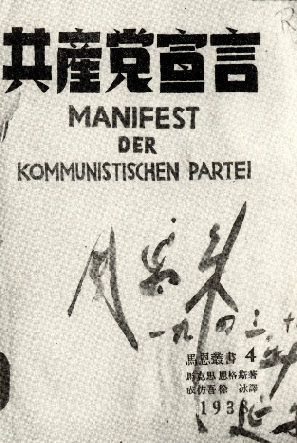 周恩来在读过的成仿吾、徐冰译本《共产党宣言》上留有签字:“周恩来,一九四三、十二、卅,延安。”