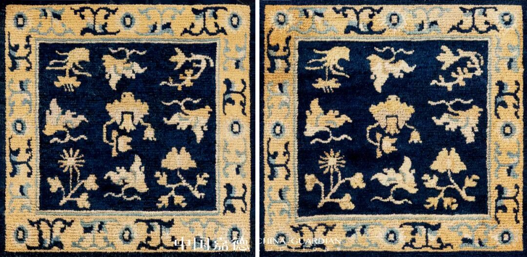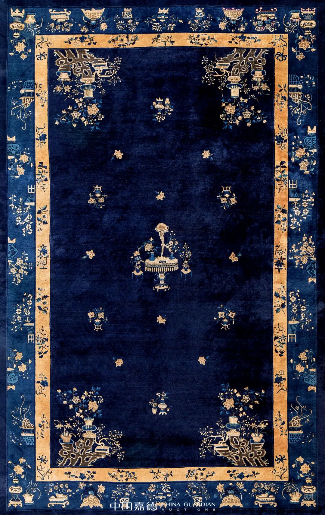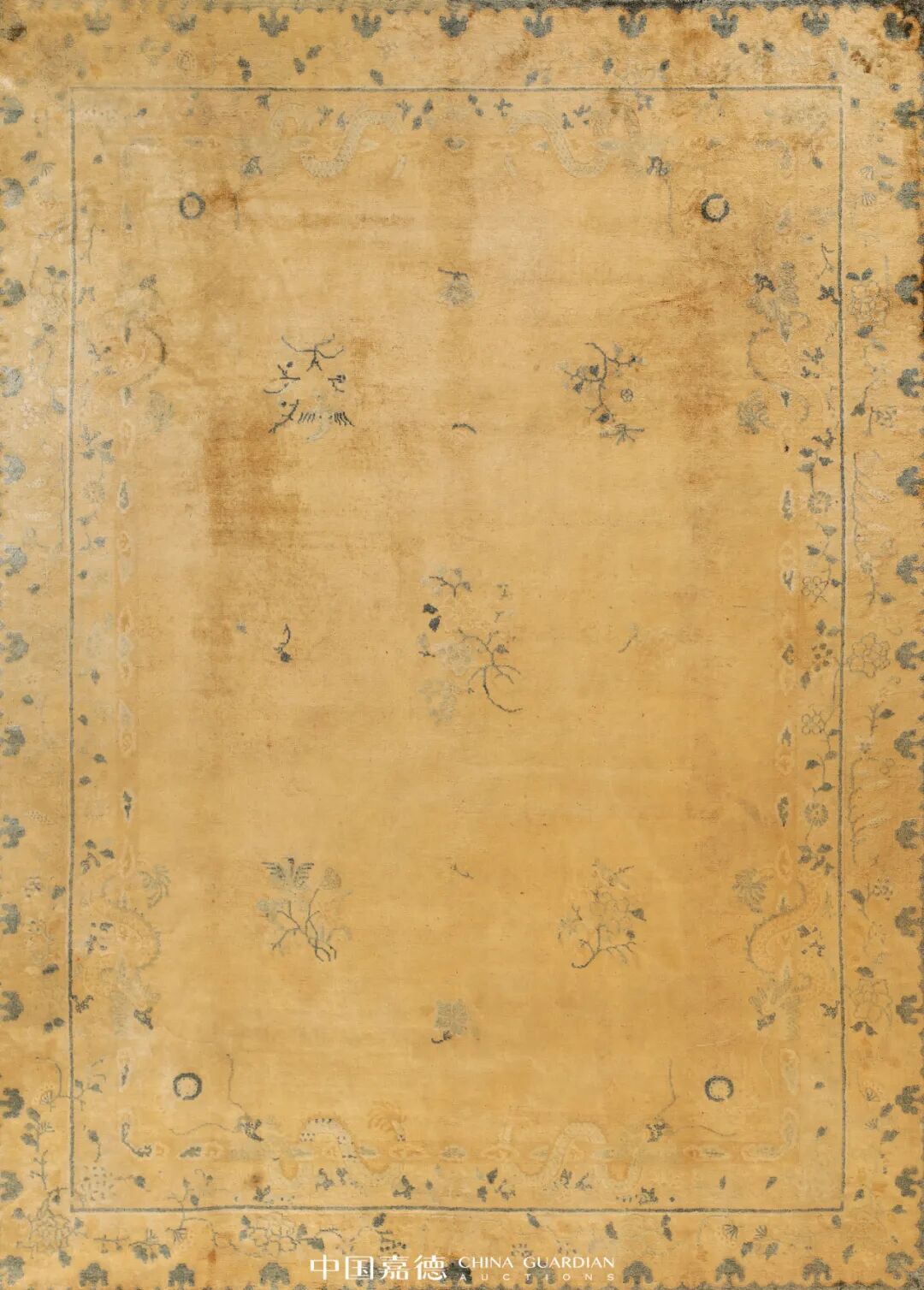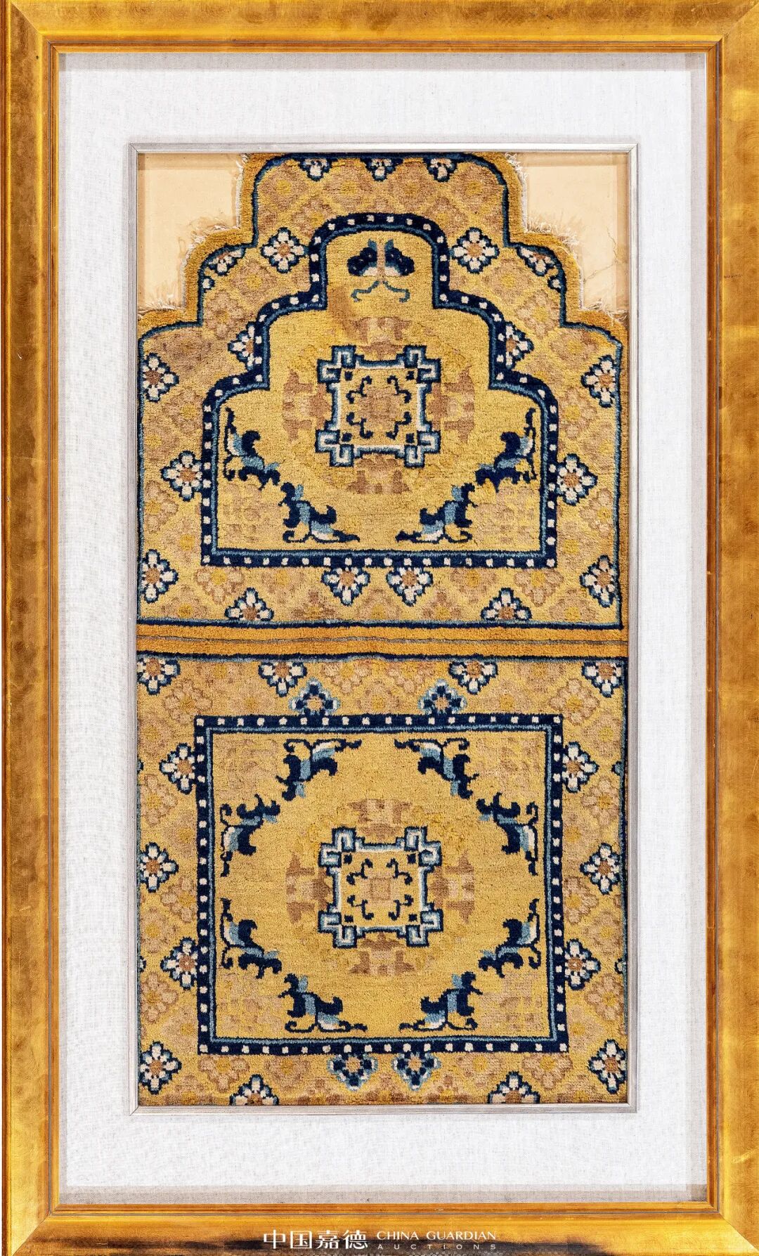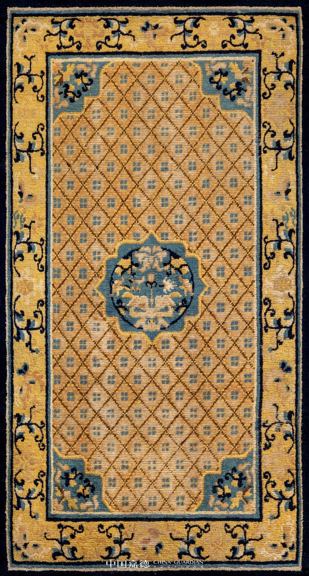 手工栽绒地毯的历史可追溯至汉代,长达两千余年。其特点是毯基挺实,毯背耐磨,毯面弹性强而牢固。《屏间雅赏-文房珍玩》专场所选的古代手工栽绒毯,共28件,用料上乘,纯手工捻棉线,栽植羊绒,采用晕色法,密而不乱地展现了旃蒻之美。