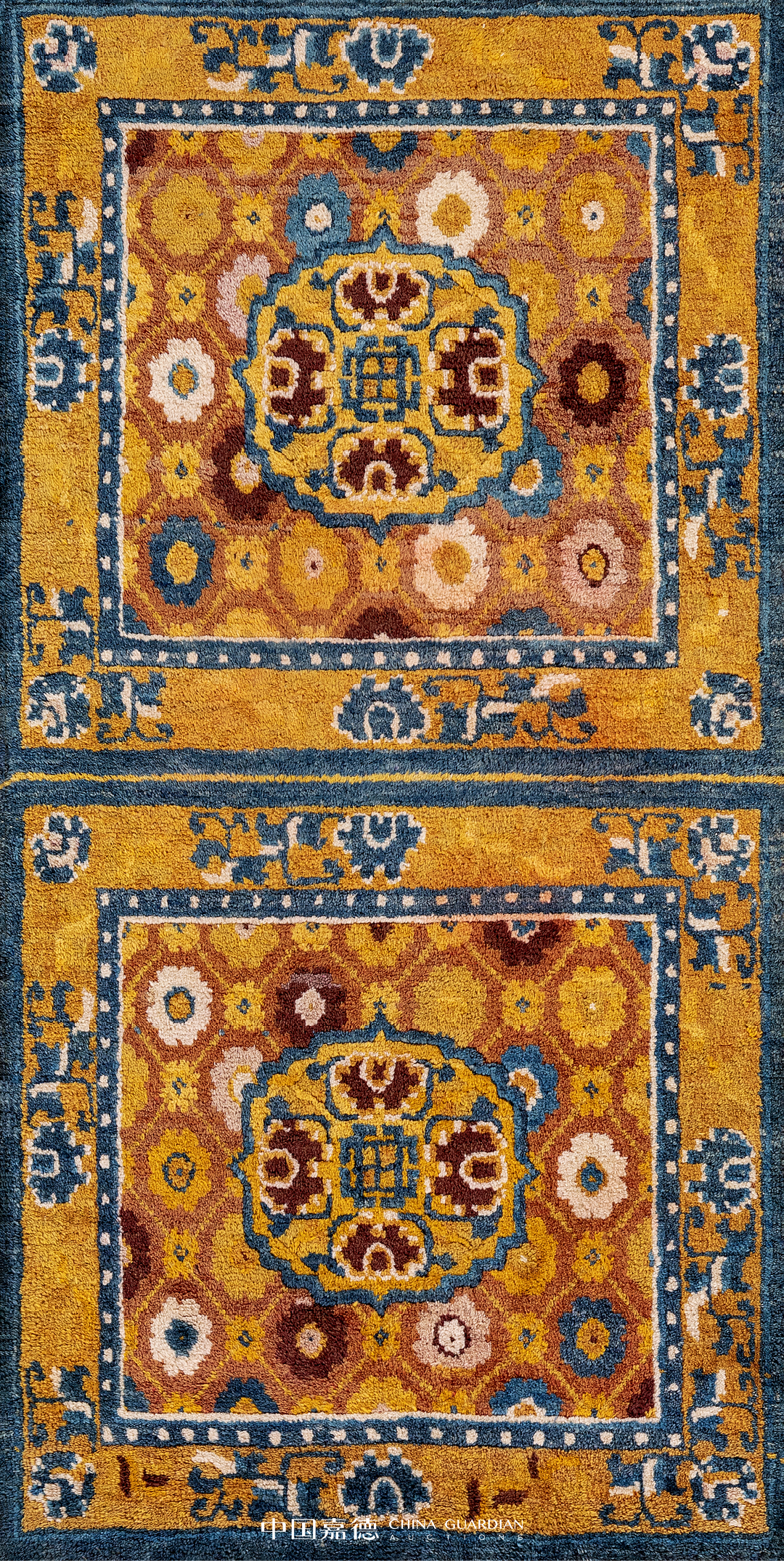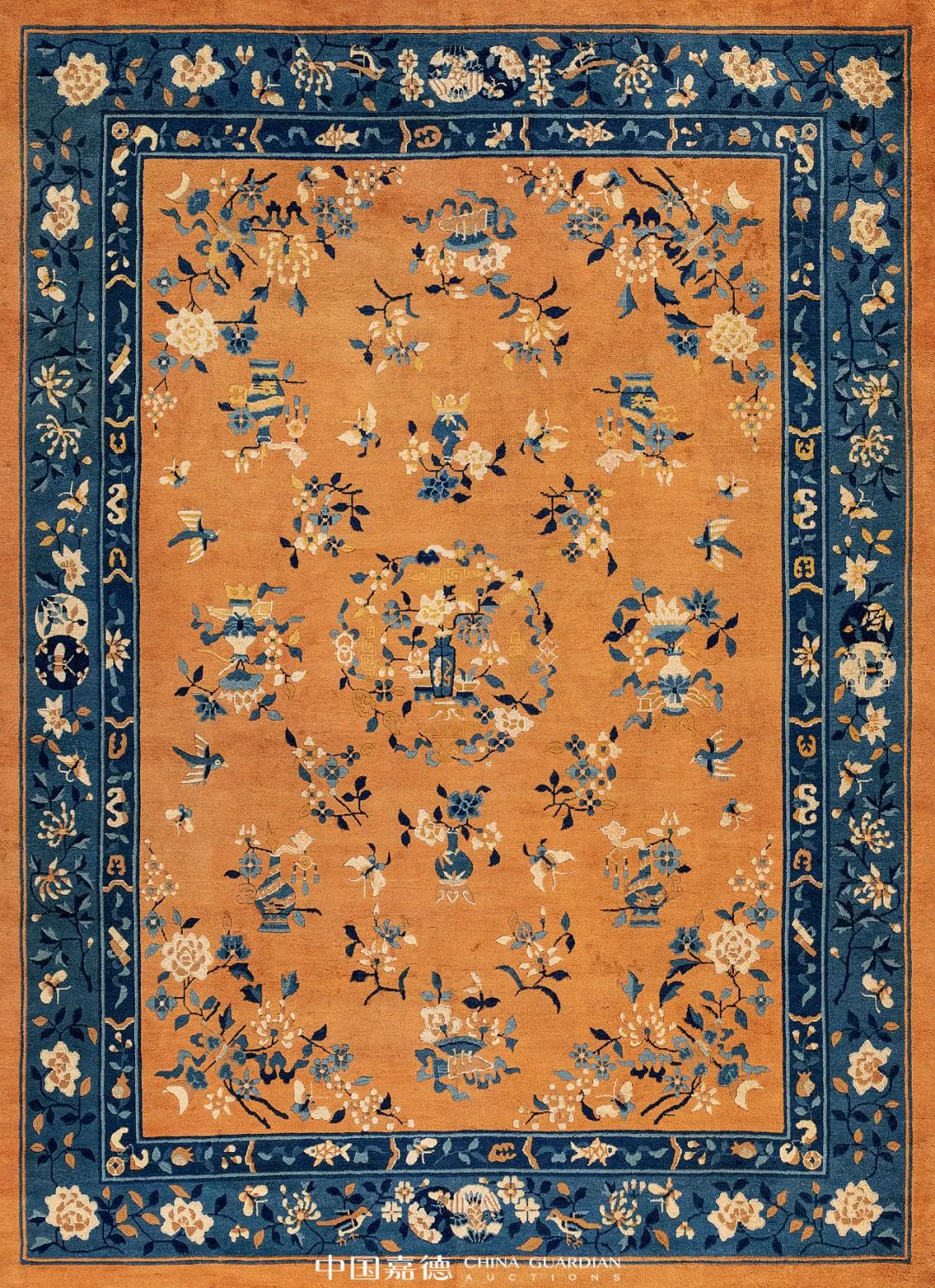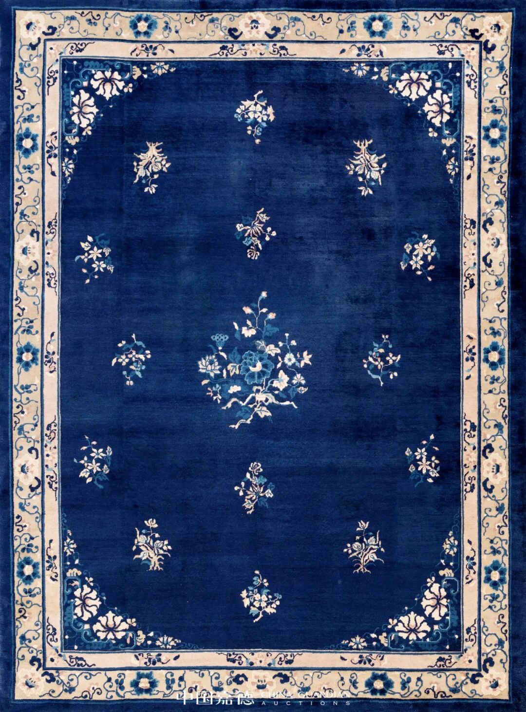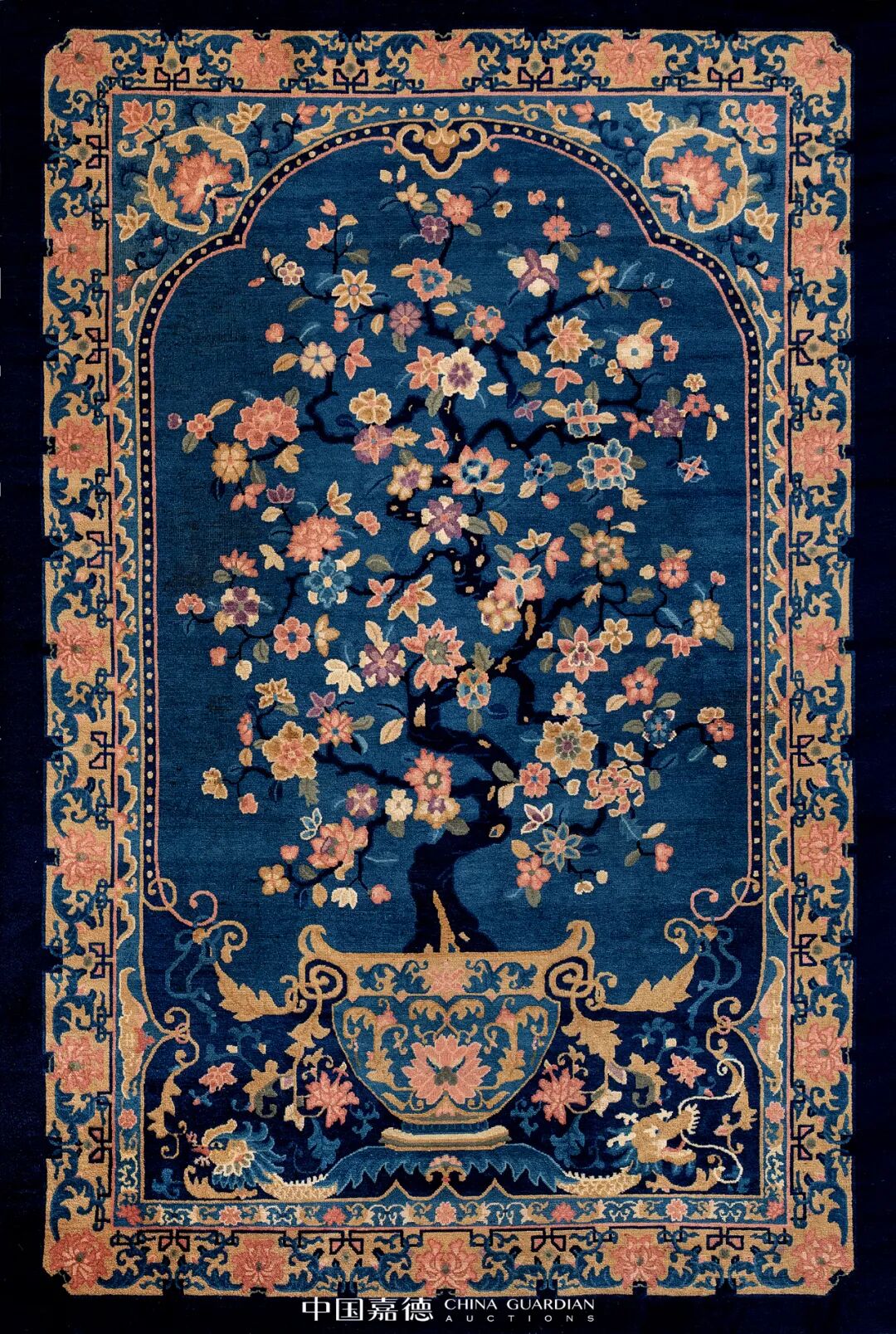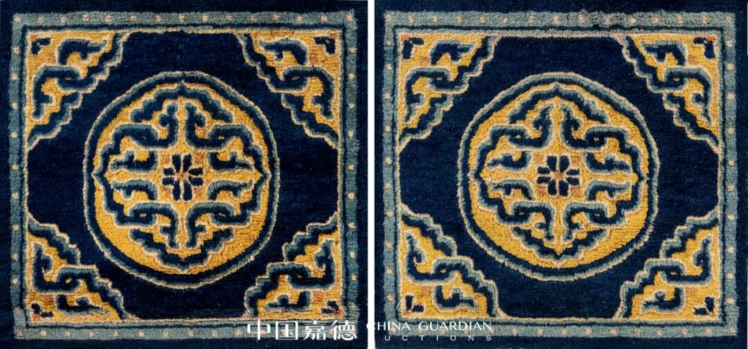 手工栽绒地毯的历史可追溯至汉代,长达两千余年。其特点是毯基挺实,毯背耐磨,毯面弹性强而牢固。《屏间雅赏-文房珍玩》专场所选的古代手工栽绒毯,共28件,用料上乘,纯手工捻棉线,栽植羊绒,采用晕色法,密而不乱地展现了旃蒻之美。