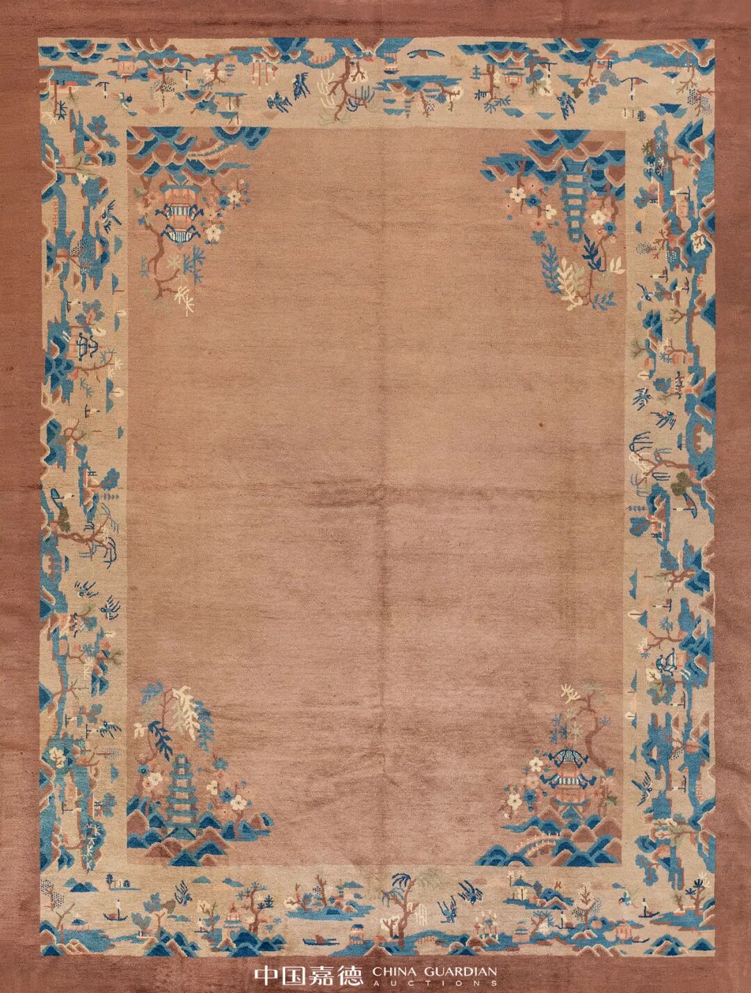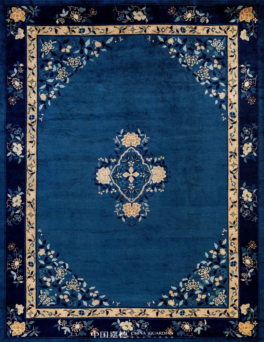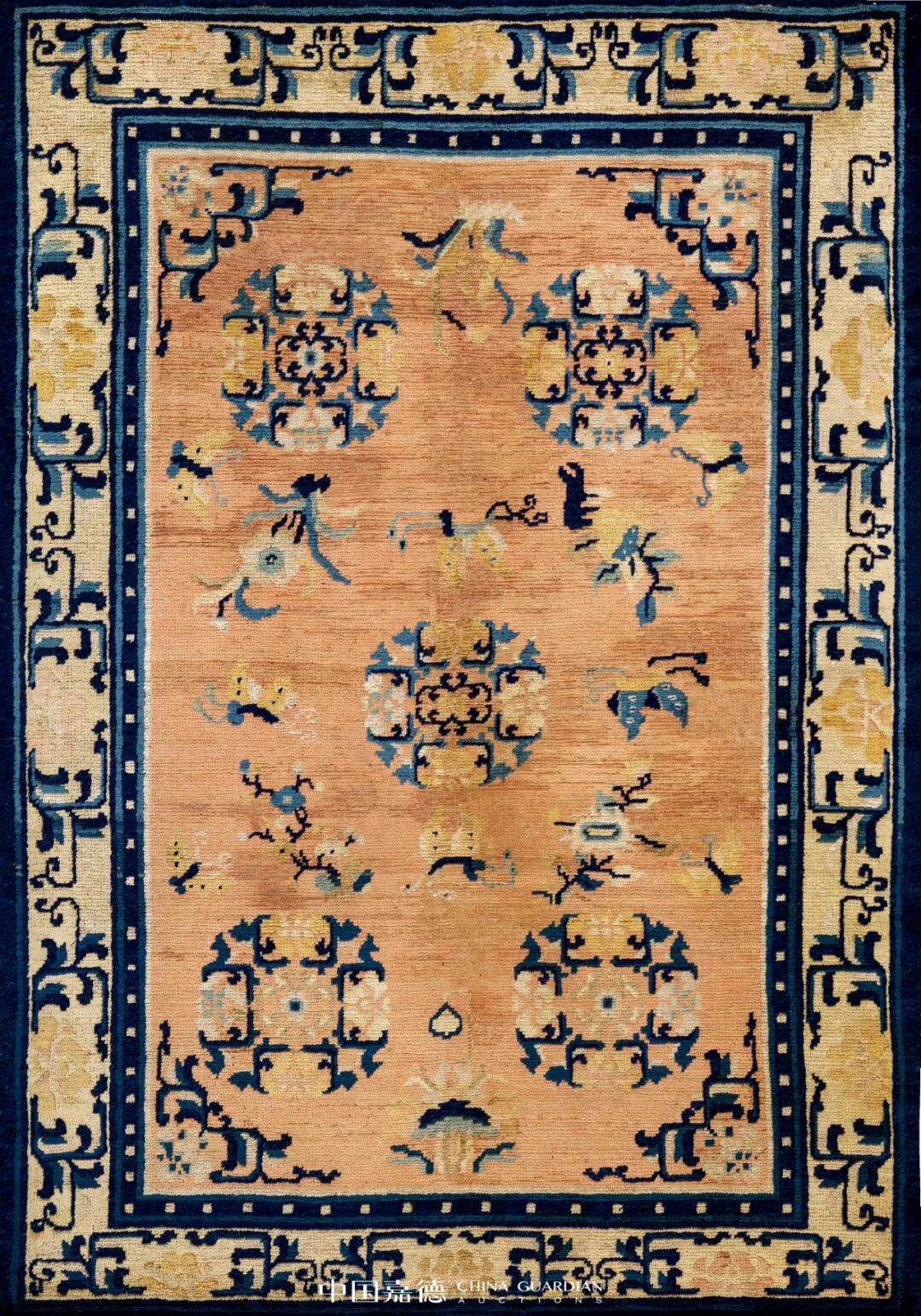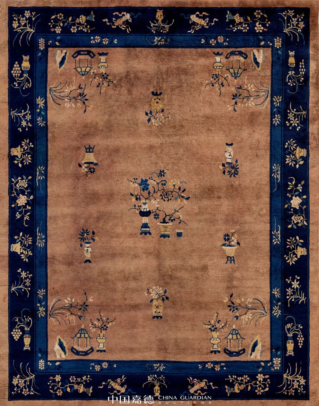 手工栽绒地毯的历史可追溯至汉代,长达两千余年。其特点是毯基挺实,毯背耐磨,毯面弹性强而牢固。《屏间雅赏-文房珍玩》专场所选的古代手工栽绒毯,共28件,用料上乘,纯手工捻棉线,栽植羊绒,采用晕色法,密而不乱地展现了旃蒻之美。