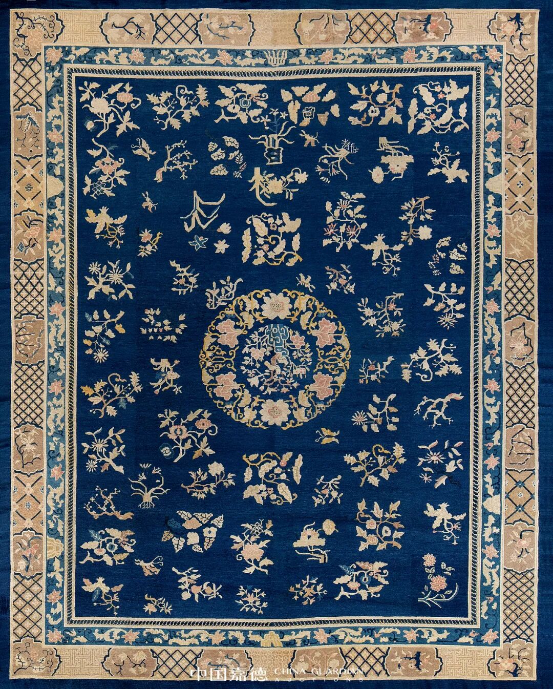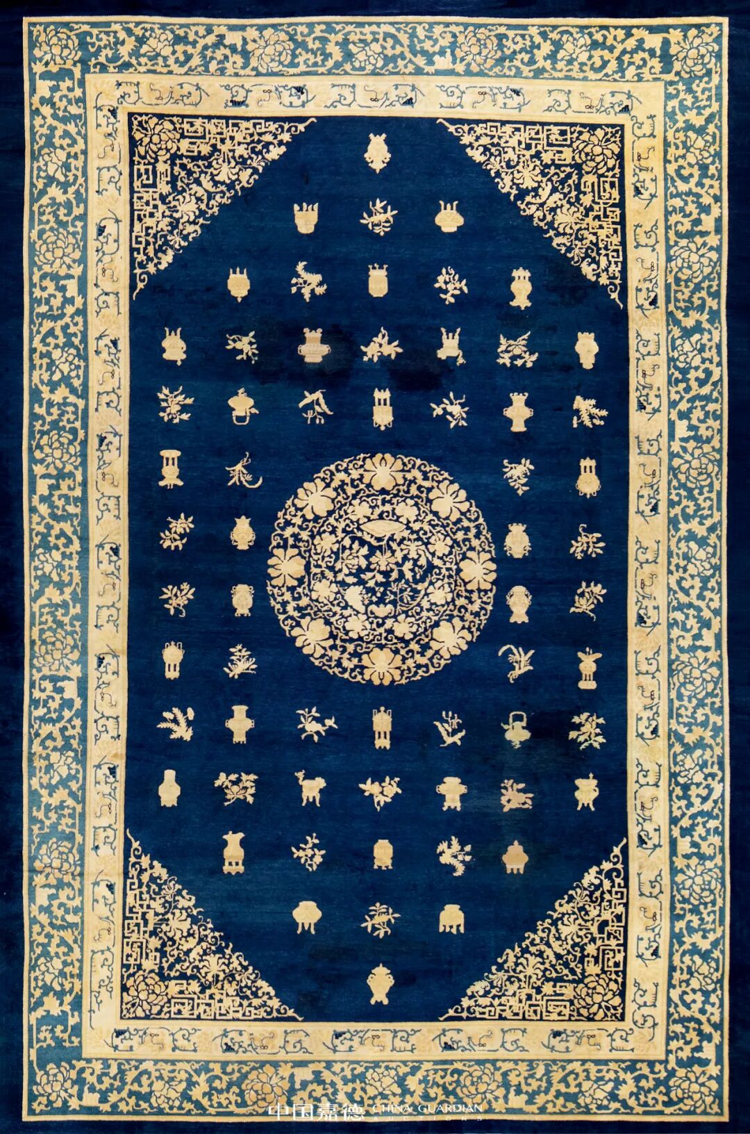 毯子用色有深蓝、浅蓝、月白、白、木红、妃、棕、浅褐、灰、米色,用色丰富。主要通过冷暖色对比法,或两晕色法,渲染得花纹古朴典雅,丰富和谐,温雅含蓄,韵味无穷。主图彰显平安富贵,吉祥如意。辅助以繁多的花纹将主图具象化,尽表其美好无尽。毯中主图在虚实之间呈双环形,且植物与器物兼而有之,妙不可言。辅图中延续主图的装饰,依旧相映成趣。毯中繁多舞动着的带子,将各题材的纹饰烘托出韵致,灼人眼目。如此具有艺术感染力的毯子,在同时期的地毯中可谓不同凡响。寓意 “平安富贵”、“同心方胜”、“幸福美满”、“富贵荣华”、“福寿绵延”、“和气生财”、“子嗣昌盛”、“太平祥和”、“福泰安康”、“洞鉴古今”、“玉堂富贵”、“高洁美好”、“诸事圆满”。地毯品相完好,弥足珍贵。