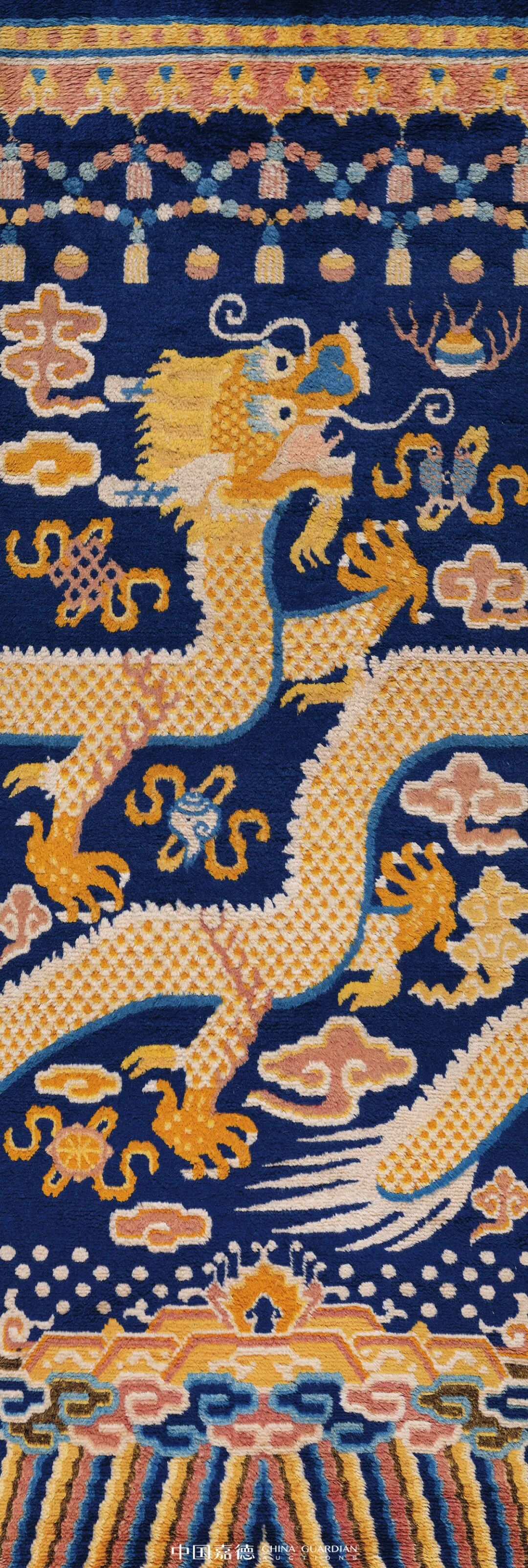 毯竖长形,藏蓝色地,上绘饰海水云龙纹。中央一条五爪巨龙作盘旋状,龙首高昂,怒目圆瞪,龙须飘逸,气势磅礴。龙身周遭绘祥云弥漫,氤氲缭绕。另有海螺、盘肠、法轮、双鱼等杂宝纹散布其间。龙首上方以连珠纹绘饰宝伞造型,简练形象。腾龙下方则绘饰海水江崖,波涛阵阵,海浪飞溅,祥云排列其间。