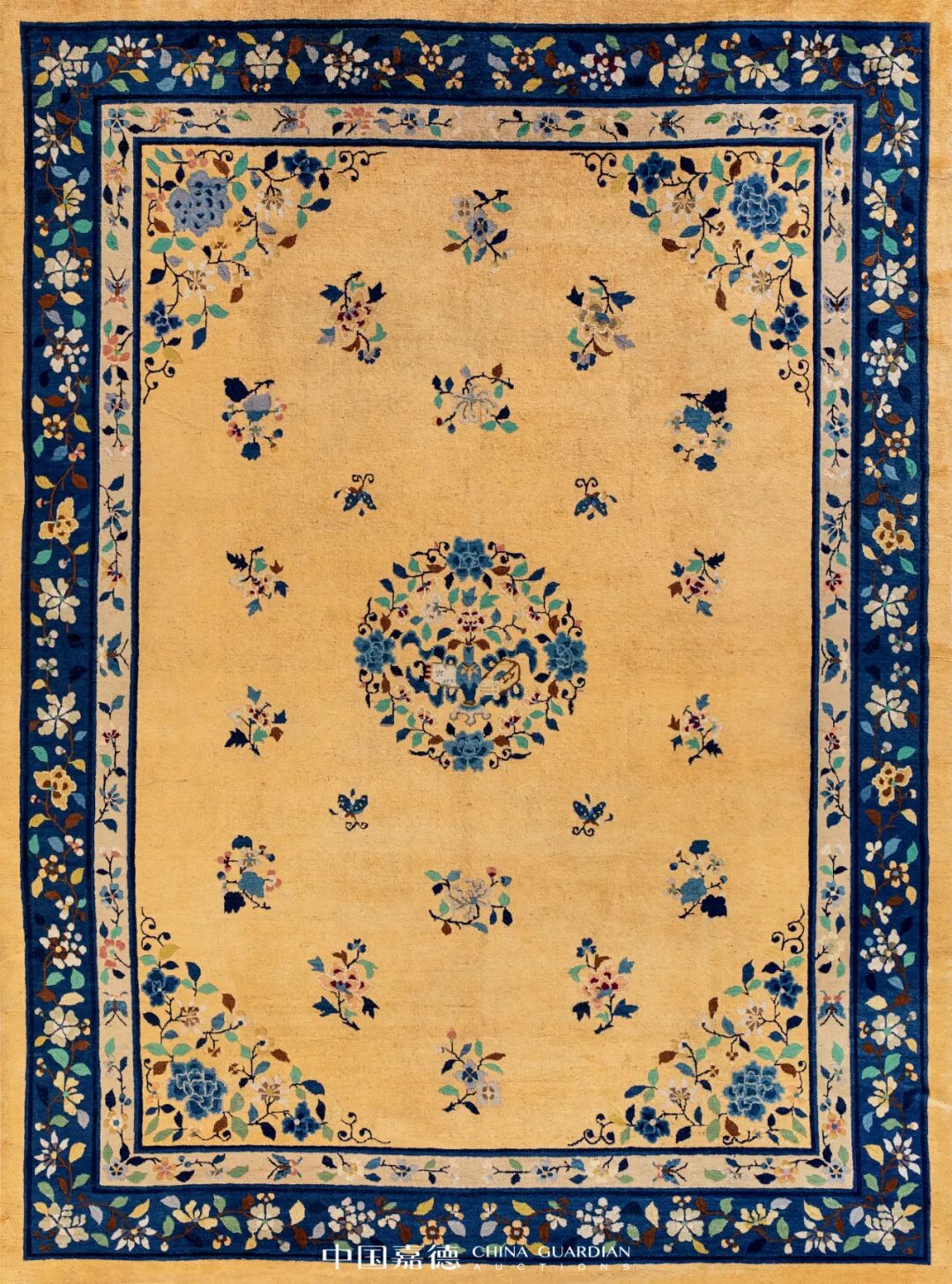 此毯色彩纯正,构图别有特色,图案设计借鉴18世纪起源于法国,后又遍及欧洲的洛可可(Rococo)装饰风格。以西方艺术构思,表现饱含中国传统吉祥含义的花纹,堪称中西合璧式的艺术装饰的典型。如此华美的艺术风格,以及赋予中国吉祥含义的的毯子,在同时期的地毯中可谓迥然不同,即可视为地毯,也可作为壁挂。根据图案特色,当属私人订制。寓意 “满园春色”、“龙凤呈祥”、“福泰安康”、“福寿绵延”、“平安美好”、“荣华富贵”、“子嗣昌盛”、“和气生财”、“万物生机”。地毯品相完好,弥足珍贵,在古旧栽绒毯中具有很高的欣赏、研究与收藏价值。