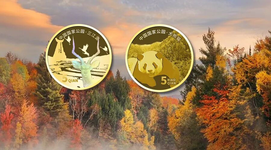 国家公园币2枚:去年停发的三江源币,及今年新增的大熊猫币。