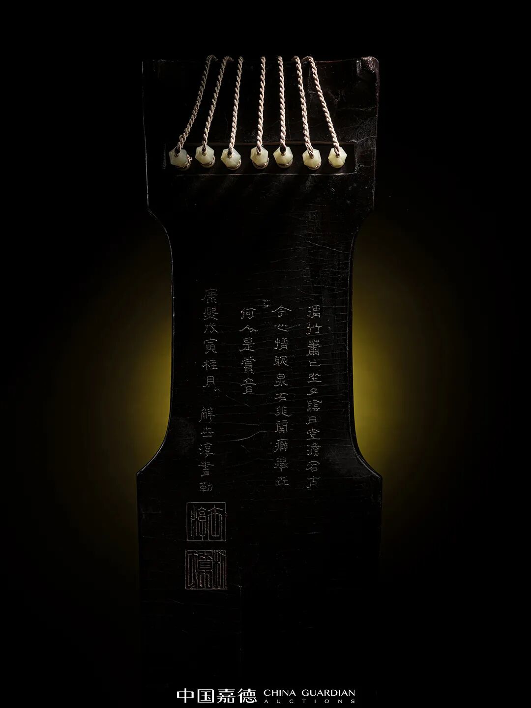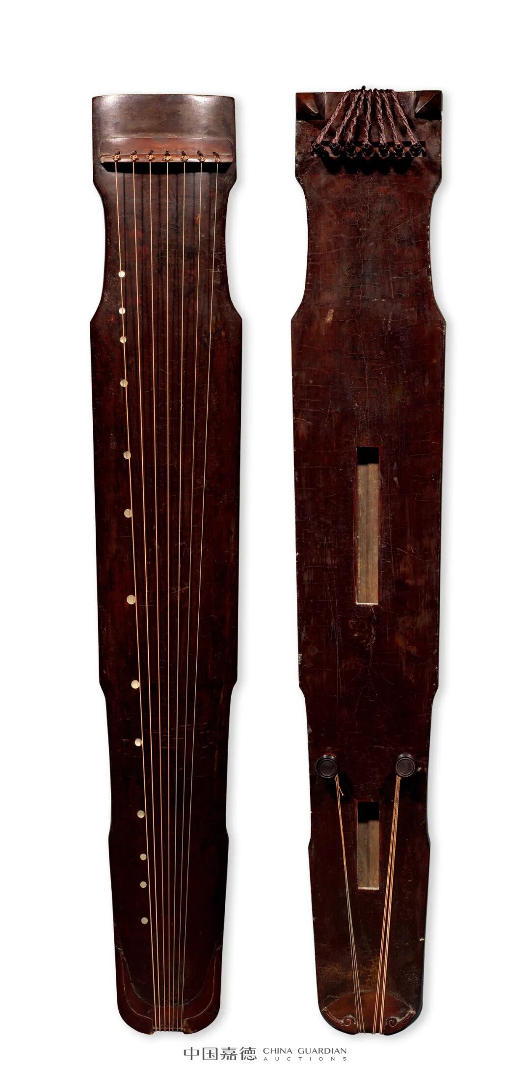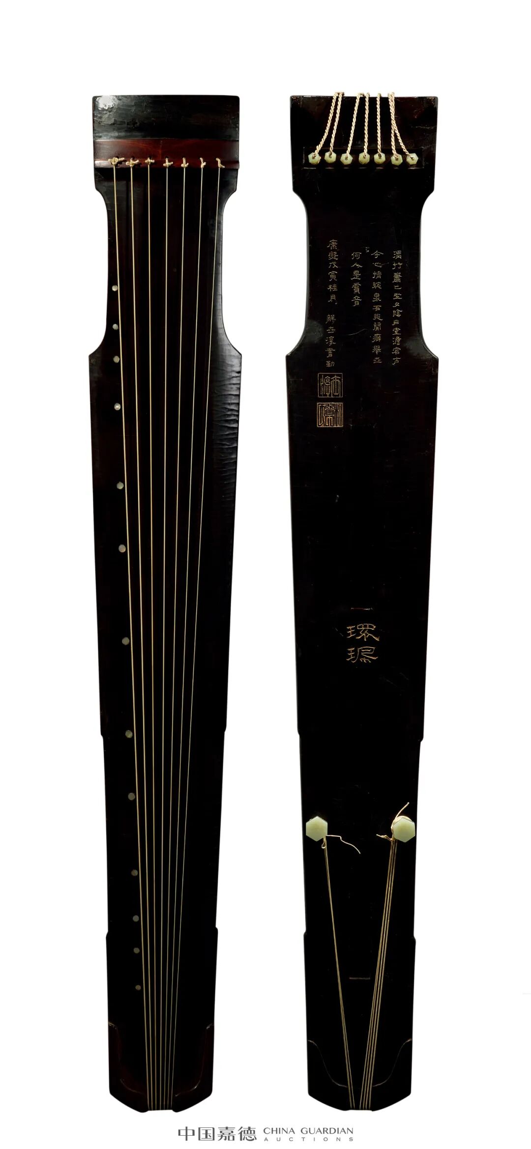 此琴仲尼式,桐木面板,琴面较平,髹栗壳色漆,鹿角霜灰胎,周身发蛇腹断,间流水、牛毛断纹。蚌徽、玉轸及雁足。琴背作长方池沼,项间镌刻隶书诗文:渭竹萧萧坐夕阴,日空澹宕今心。情耽泉石非关癖,举世何人是赏音。康熙戊寅(1698)桂月,解世淳书勒。印文:世淳、利质氏。龙池下镌隶书琴名“环佩”。龙池两侧腹款:民国十年岁在辛酉暮春,毕节路朝銮属潞安秦华重修。此琴形制特点与故宫博物院所藏、清宫遗存“海月清辉”仲尼琴极为相似,属南宋赵希鹄《洞天清录集》所述形制“耸而狭”的一类。古琴研究泰斗郑珉中先生在《两宋古琴浅析》一文中曾介绍南宋后期琴以“海月清辉”琴最为典型,可兹比较。