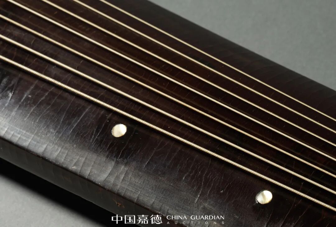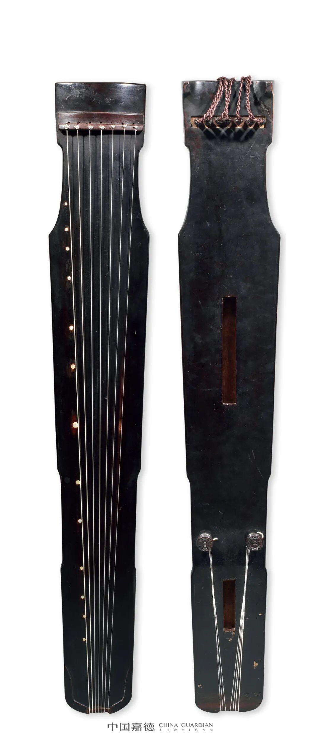 此琴仲尼式,周身髹黑栗黑色大漆,漆胎较薄,冠角、岳山、承露由紫檀木所制。黄杨木琴轸,螺钿徽甚是小巧。肩在二徽处。琴背龙池、凤沼为长方形。琴腹内木质古旧。此琴琴体修长匀称,形制规范,有宋琴风韵。抚奏,其琴音松透深厚,静而不嚣。