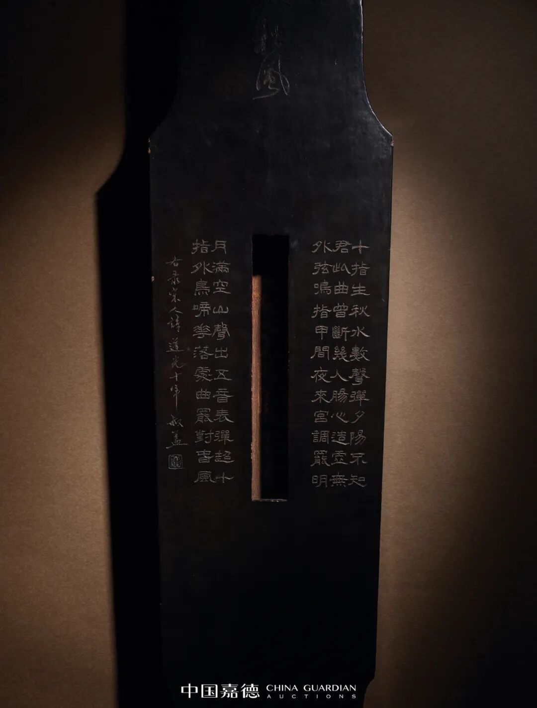 此琴仲尼式,杉木斫,周身髹黑色大漆,螺钿徽,黄杨岳尾。琴背项间镌行书“万丈秋风”琴铭,龙池内两侧墨书:“道光三十年岁次庚戌月应南吕,殿卿滕冠英□造”。龙池两侧镌隶书诗文:“十指生秋水,数声弹夕阳。不知君此曲,曾断几人肠?心造虚无外,弦鸣指甲间。夜来宫调罢,明月满空山。声出五音表,弹超十指外。鸟啼花落处,曲罢对春风。”款识:右录宋人诗,道光十年叔盖。印文:钱松。龙池与凤沼间镌印:四义堂主。凤沼两侧镌印:方濬颐印信富贵寿康、砚云山馆、泽闓鉴赏。