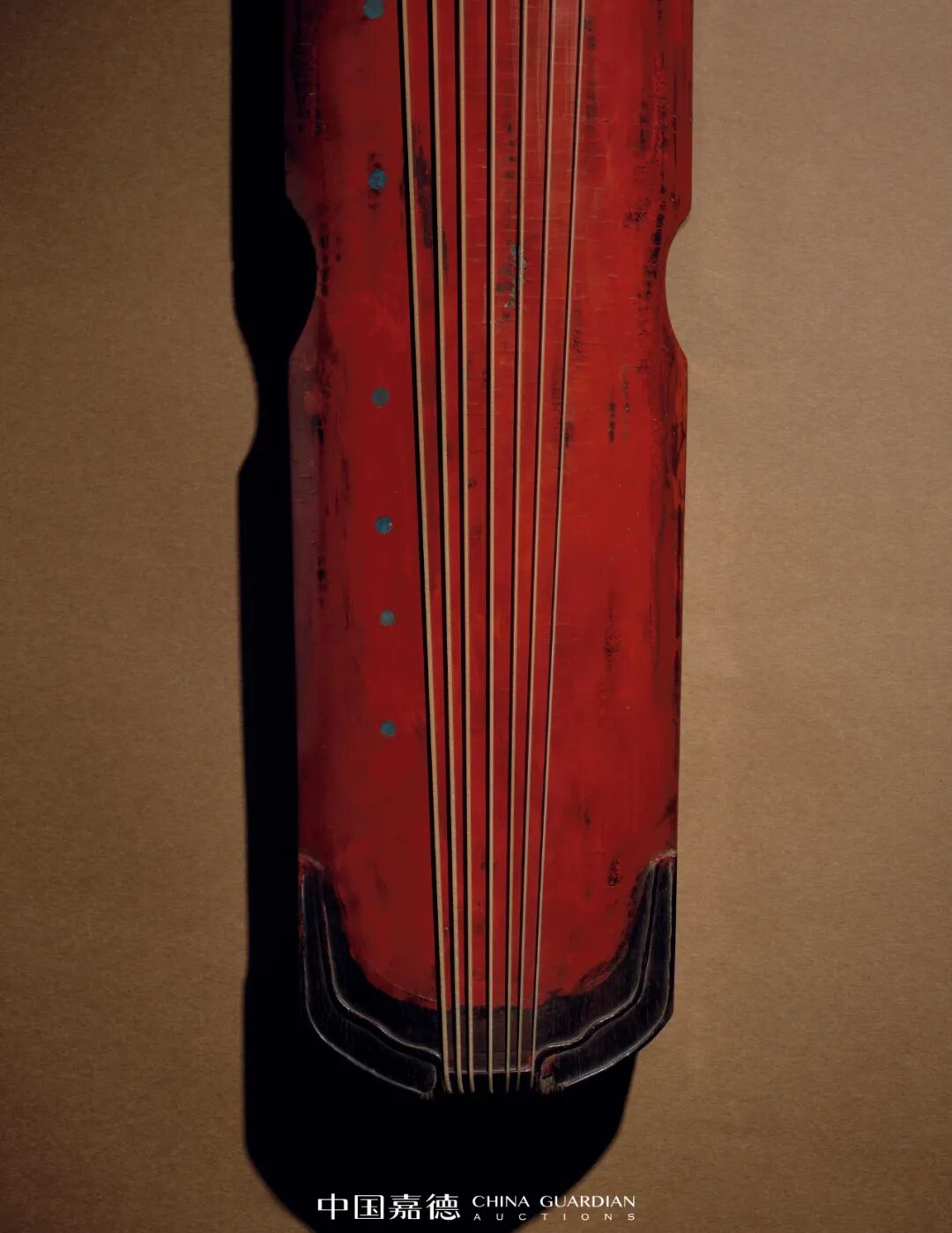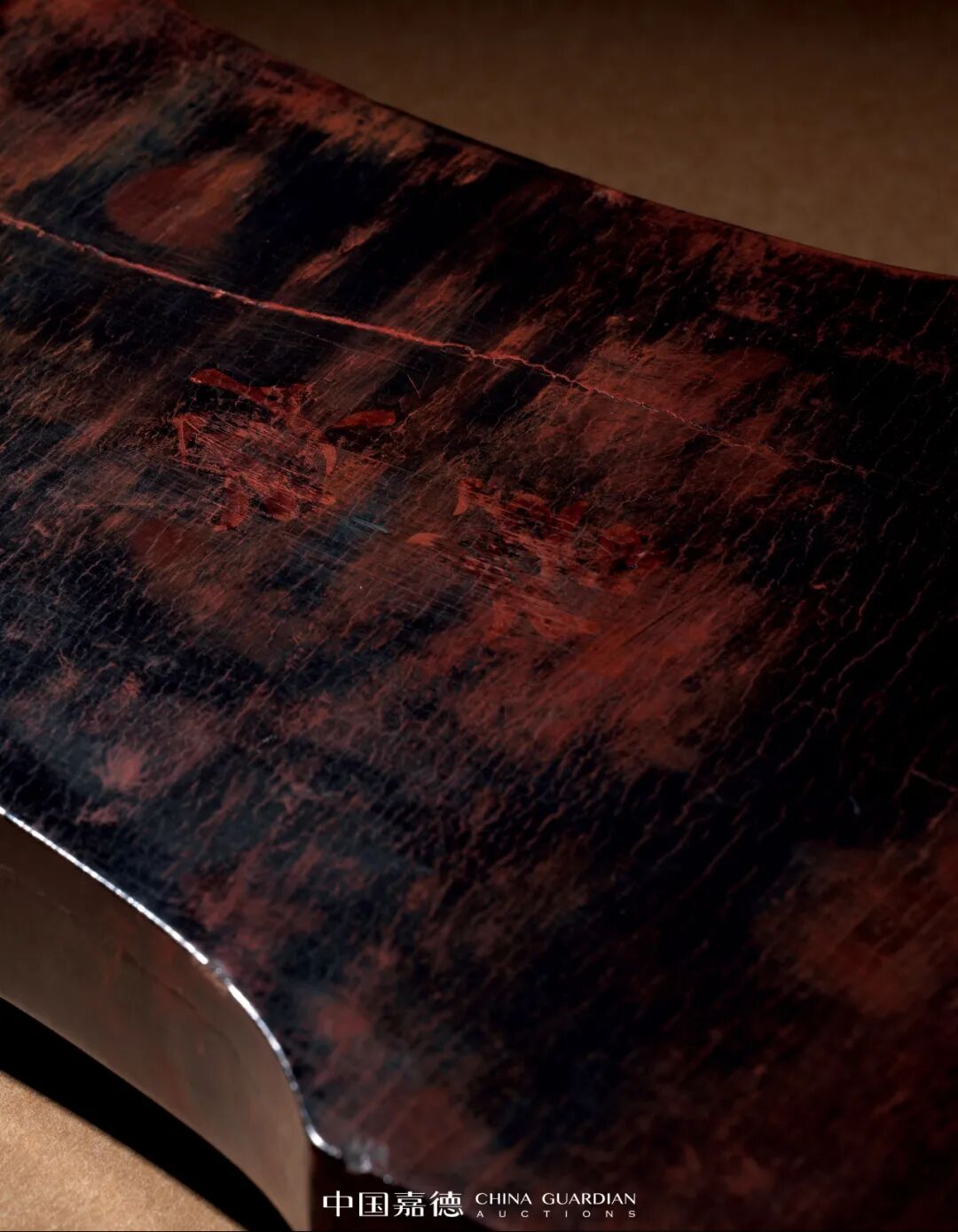 琴体漆色红黑相间,原始黑栗色漆面上有一层云雾状朱红漆,琴面朱漆浅淡稀薄,琴底朱漆则或浓或淡,又有二次修复所涂朱漆,与原有的漆面浑然一体,形成色彩斑驳的暖色调。漆面断纹形态丰富,有牛毛断、流水断、蛇腹断,局部还有难得一见的梅花断,所有断纹均无剑峰,丝毫不影响弹奏,说明这张琴的灰漆与木胎结合紧密,质地坚实,在断开以后没有出现起翘和空鼓。琴头磕缺处可见灰漆下有一层黄色的夏布,包裹着木胎,正是有这些髹漆工艺的保护,琴体稳定才得以传延至今。