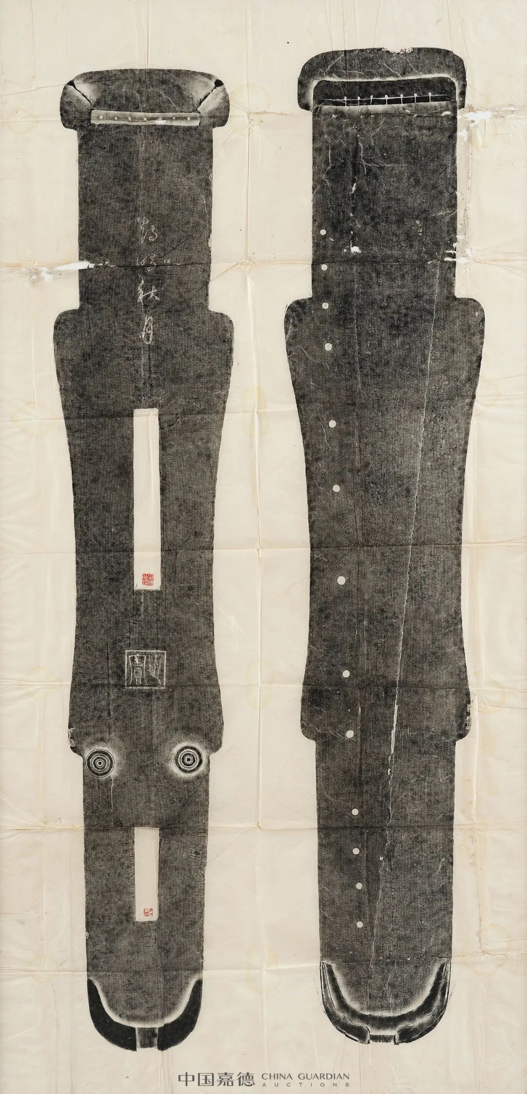 古琴作为除青铜器以外的收藏品,因其优美的造型、丰富的断纹(漆面因年久而形成自然的开片裂纹)、温润的音色而被世人所宝。其远古的断纹更是让玩家和琴家津津乐道的话题;六舟这样一位具有高度审美的金石僧当然不会错过给古琴来个全形拓的机会,凡得珍器佳制,必以全形拓之,今浙江博物馆珍藏有六舟手拓“宋代 文天祥春雷琴全形拓片”既是十分珍贵的艺术珍品,亦能作为本件拍品的参考、评判之作。