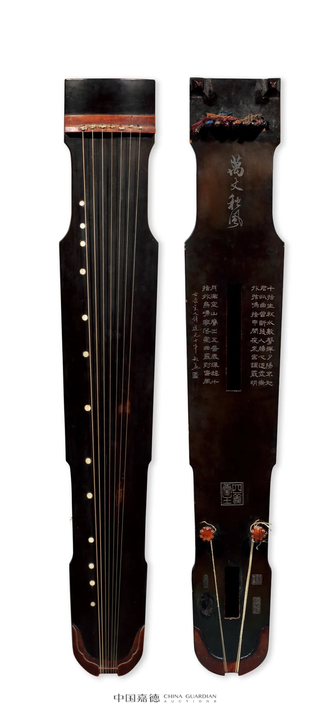 黄万金(1918-1999),解放以后在天津老城门一代被称为“一代侠医”,医术高深,且精研武术,对多家武术皆有造诣,为道家龙门派第十三代传人。黄先生早期曾任天津新业公司总经理高渤海的总管参谋。高渤海(1910-1982),天津八大家高星桥之子。高星桥1928年创办天津最大的商场天津劝业场。其子高渤海因爱好京剧,在天津劝业场经营天华景戏院。1945年成立渤海影业公司,经营大光明、天津天宫、天华景各影戏院并承包影片进口生意。1946年应苏联大使之聘,任苏联亚洲影片公司经理及华北、东北文化交流代表。1948年,高渤海接任新业公司总经理,经营天津劝业场、交通旅馆、龙泉浴池、渤海大楼等房地产。1933年,天津渤海大楼,由庆亲王载振(1876-1947)与高星桥合股共同建设,高渤海参与管理。1936年,渤海大楼竣工,建成时为天津市最高大、最新式的现代风格高层建筑。高星桥以其子高渤海之名,为大楼起名为“渤海大楼”。当时,清庆亲王亦非常恭敬作为高渤海总管参谋的黄万金,并时常向他请教命运之事。庆亲王因知黄万金有古琴之爱好,后将自己收藏的古琴作为酬谢相赠。此件“万丈秋风”仲尼式古琴正是当年庆亲王载振所赠,并曾刻有清庆王载振的名号。六七十年代特殊时期,黄先生因担心引起事端,用大漆抹掉庆亲王载振的名号。