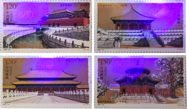复杂的工艺里,最让人惊喜的是“600周年”彩蛋。使用荧光灯照射时,我们可以在票面的空白处看到“600”的荧光暗记。这是紫禁城600年的独特礼物,在以往的邮票中是见不到的。
