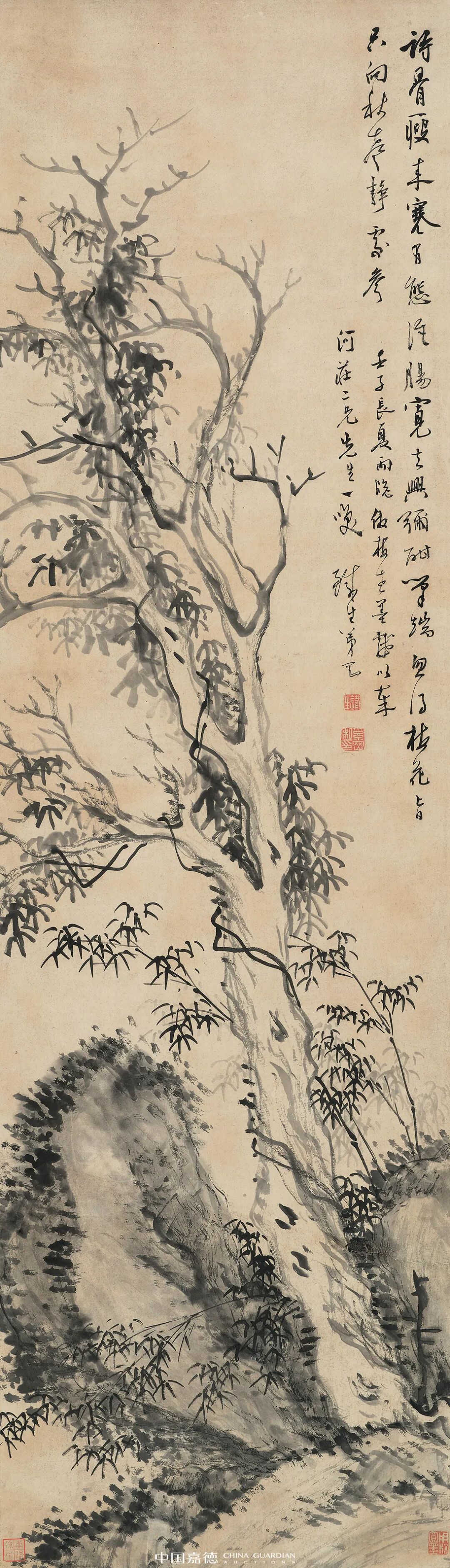 题识:诗骨瘦来寒有态,酒肠宽去兴弥酣,笔端忽得梅花旨,只向秋声静处参。壬子长夏雨窗仿梅老墨戏以奉河庄二兄先生一笑。铁生弟冈。