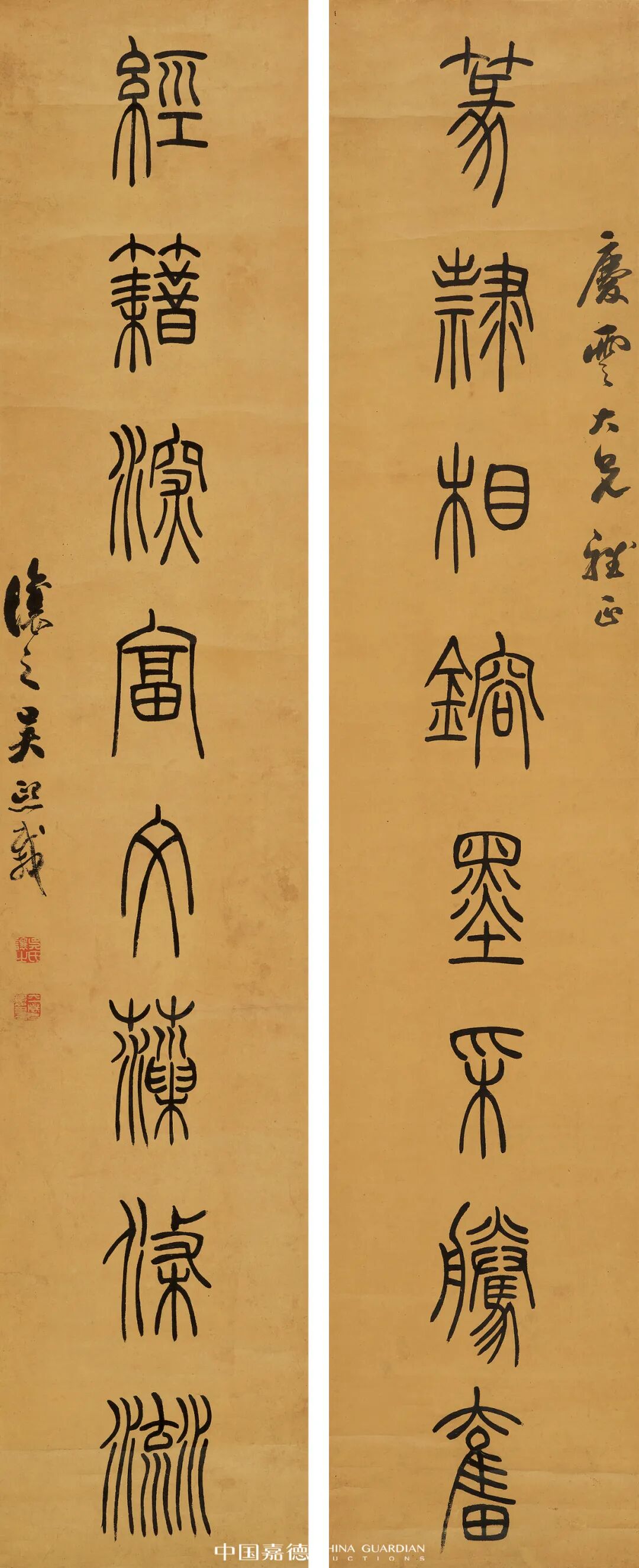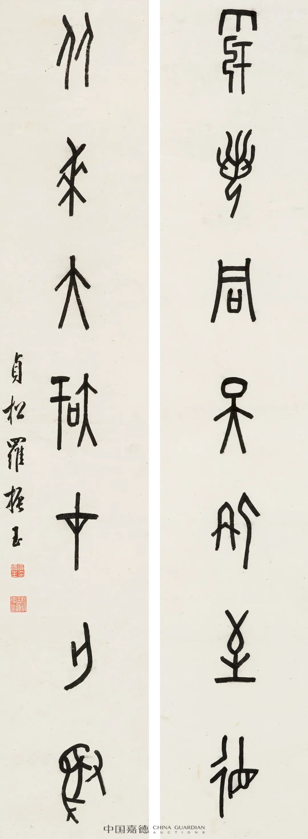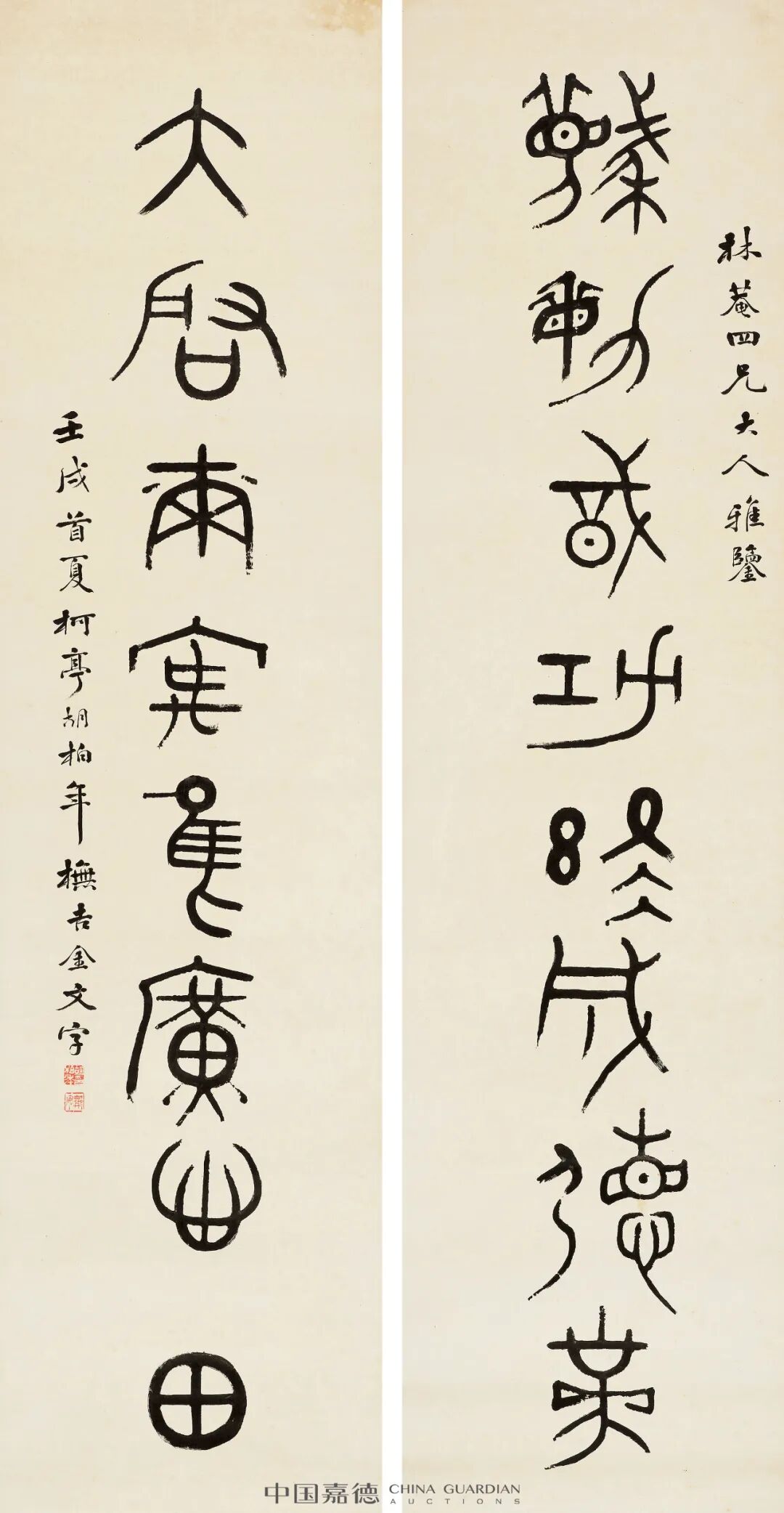 篆书是清代贡献给书法史最重要的成就之一,金石家们自然是其中的核心力量。作为上承邓石如、下启赵之谦的关键人物,吴让之(1799-1870)书法成就中最高的便是篆书,其六十岁后所书《篆书八言联》为成熟时期的典型面貌,用笔圆劲俊拔,字形婀娜飘动,比之邓石如,更有一种前人所少有的轻松曼妙的神采。而胡澍(1825-1872)所书《篆书八言联》则更加强调笔墨和结字的变化,篆书在此时显得更有书写的趣味,赵之谦对其篆书评价很高,曾说胡澍在的时候他不敢写篆书——其实,他们的这种写法都曾受到另一个被忽略的金石家、包世臣的学生德林的影响。而到了清末,随着青铜器的大量出土和甲骨的发现,金文、甲骨文也陆续被运用到书法创作中。罗振玉(1866-1940)是甲骨文历史上最重要的学者之一,鼎鼎大名的“甲骨四堂”中的雪堂,也是甲骨文书法的先行者之一。其《甲骨文七言联》取甲骨之字形而使篆籀之笔法,笔致苍劲拙朴,比之后来人写甲骨一味模拟刀刻痕似乎更显典雅大方。由落款中“松翁居辽后作”一印可知此为其民国十七年(1928)年后随废帝溥仪迁居旅顺后所书,时年应在63岁后。130.5×26.3 cm×2; 约3.2 平尺(每幅)159.5×31.5 cm×2; 约4.6 平尺(每幅)124.8×23 cm×2; 约2.6 平尺(每幅)另如萧蜕庵《篆书七言联》和胡柏年《金文七言联》两件作品也颇为罕见。萧蜕庵(1876-1958)为民国时期著名篆书大家,技法精熟,能将雄强与优美两种不同的气质融合在一起,开创了一种极具辨识度的个人风格,有“虞山第一书家”之称。然此书苏东坡句《篆书七言联》却有别于其常见作品,乃特意以秦人玉箸篆为之,清丽中透着古朴。在四条长长的边跋中,他评论了玉箸篆的历史流变,隐隐表明了他在写这件作品时似乎有与古人争一地位的想法。胡柏年(1877-1923)字柯亭,号许安,是寓居济南的绍兴籍书画家、收藏家,家藏金石书画碑帖甚丰,印章就有千余钮。善绘事,工篆隶,尤擅篆刻,有《抱影庐印存》行世。此作以金文出之,结体却宽博舒展,笔墨功夫老练沉稳,气息高古奇崛。款识:鼎彝先生属篆。明丰坊云:大篆变为小篆,小篆变为玉筋,愈趋愈巧。夫石鼓诅楚尚讼三代钟鼎款识之遗意,随字画多寡而为形者;若泰山碑及汉崔子玉书、张平子碑,渐觉整齐,李阳冰、徐铉辈远古矣。甲戌涂月书东坡句仿玉筋体,退闇。款识:林庵四兄大人雅鉴,壬戌首夏柯亭胡柏年橅吉金文字。167.5×43 cm×2; 约6.6 平尺(每幅)此外,尚有王震(1867-1938)设色《无量寿佛》与吴藏龛(1876-1927)设色《天香深处》两开扇面值得一提。此二人,一为吴昌硕密友、学生、推手,一为吴昌硕最得意的儿子,而二人又是吴氏的代笔、代刀者,从这两件作品同样能明显感受到来自吴昌硕的影响。王氏作品作于民国十三年(1924)甲子夏,红衣罗汉静坐山石莽榛间,用笔虽奔放,然比其寻常大刀阔斧的作品却多了许多祥和内敛的气息;吴藏龛花卉则作于民国十一年(1922)壬戌夏天,色彩浓颜,笔墨淋漓,金石味与老缶简直如出一辙。题为拟张北平,张北平即张孟皋,吴昌硕也有不少作品临仿自他。由于天不假年,吴藏龛传世作品并不多,此帧为嘉兴书画家金兰坡旧藏。题识:天香深处度长春。壬戌夏仲拟张北平设色,仲轩先生幸正之,安吉吴臧龛。