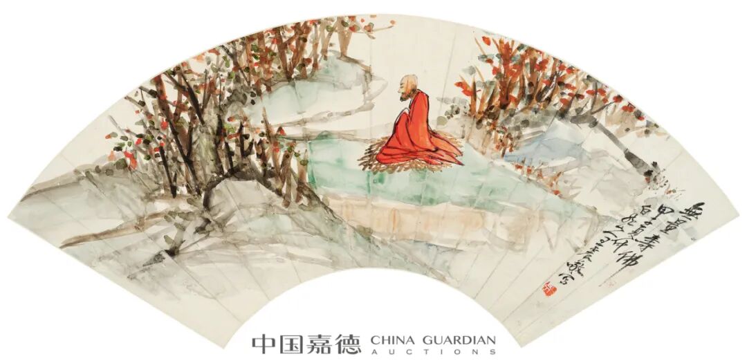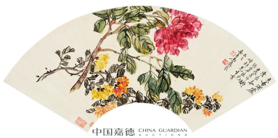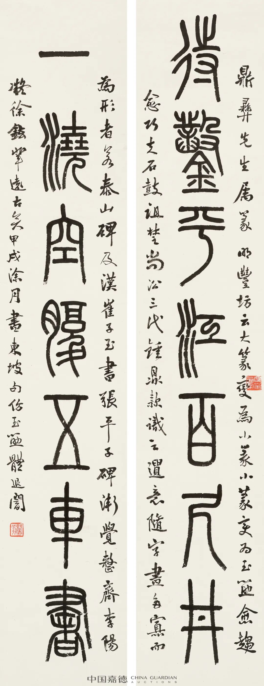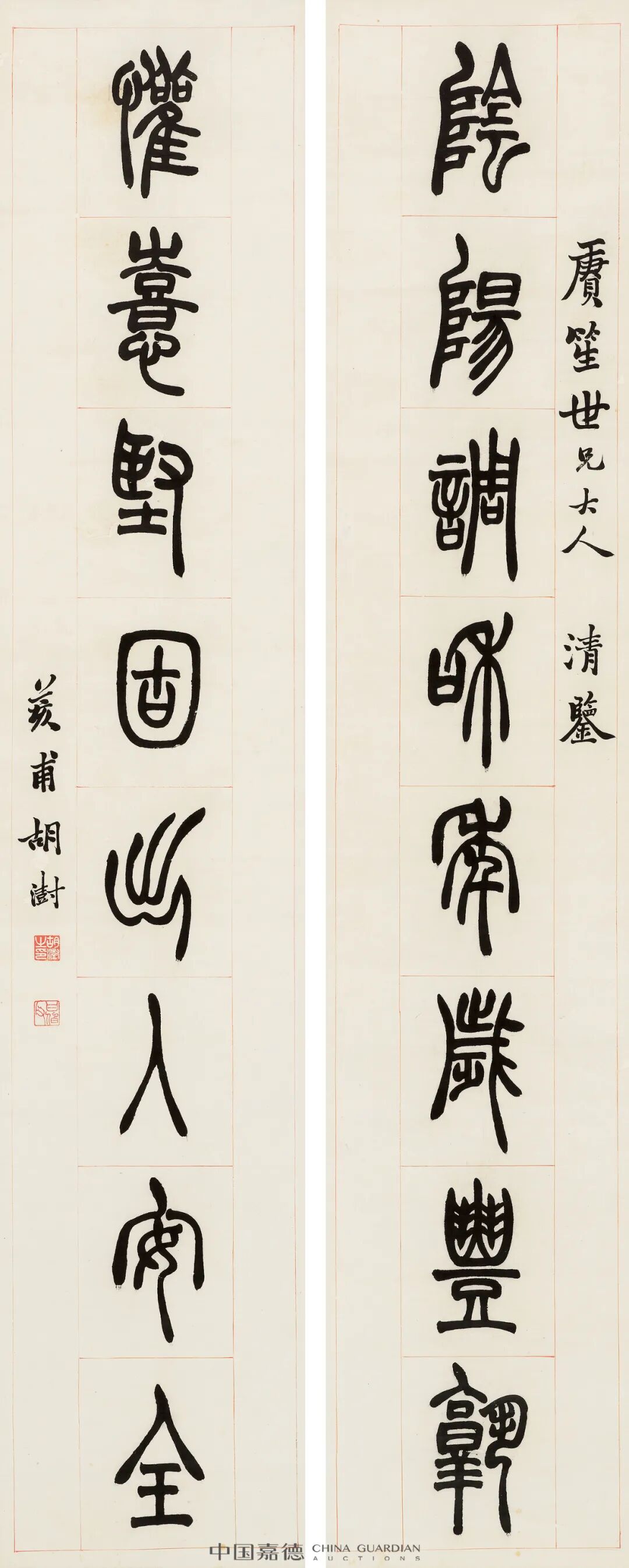 篆书是清代贡献给书法史最重要的成就之一,金石家们自然是其中的核心力量。作为上承邓石如、下启赵之谦的关键人物,吴让之(1799-1870)书法成就中最高的便是篆书,其六十岁后所书《篆书八言联》为成熟时期的典型面貌,用笔圆劲俊拔,字形婀娜飘动,比之邓石如,更有一种前人所少有的轻松曼妙的神采。而胡澍(1825-1872)所书《篆书八言联》则更加强调笔墨和结字的变化,篆书在此时显得更有书写的趣味,赵之谦对其篆书评价很高,曾说胡澍在的时候他不敢写篆书——其实,他们的这种写法都曾受到另一个被忽略的金石家、包世臣的学生德林的影响。而到了清末,随着青铜器的大量出土和甲骨的发现,金文、甲骨文也陆续被运用到书法创作中。罗振玉(1866-1940)是甲骨文历史上最重要的学者之一,鼎鼎大名的“甲骨四堂”中的雪堂,也是甲骨文书法的先行者之一。其《甲骨文七言联》取甲骨之字形而使篆籀之笔法,笔致苍劲拙朴,比之后来人写甲骨一味模拟刀刻痕似乎更显典雅大方。由落款中“松翁居辽后作”一印可知此为其民国十七年(1928)年后随废帝溥仪迁居旅顺后所书,时年应在63岁后。130.5×26.3 cm×2; 约3.2 平尺(每幅)159.5×31.5 cm×2; 约4.6 平尺(每幅)124.8×23 cm×2; 约2.6 平尺(每幅)另如萧蜕庵《篆书七言联》和胡柏年《金文七言联》两件作品也颇为罕见。萧蜕庵(1876-1958)为民国时期著名篆书大家,技法精熟,能将雄强与优美两种不同的气质融合在一起,开创了一种极具辨识度的个人风格,有“虞山第一书家”之称。然此书苏东坡句《篆书七言联》却有别于其常见作品,乃特意以秦人玉箸篆为之,清丽中透着古朴。在四条长长的边跋中,他评论了玉箸篆的历史流变,隐隐表明了他在写这件作品时似乎有与古人争一地位的想法。胡柏年(1877-1923)字柯亭,号许安,是寓居济南的绍兴籍书画家、收藏家,家藏金石书画碑帖甚丰,印章就有千余钮。善绘事,工篆隶,尤擅篆刻,有《抱影庐印存》行世。此作以金文出之,结体却宽博舒展,笔墨功夫老练沉稳,气息高古奇崛。款识:鼎彝先生属篆。明丰坊云:大篆变为小篆,小篆变为玉筋,愈趋愈巧。夫石鼓诅楚尚讼三代钟鼎款识之遗意,随字画多寡而为形者;若泰山碑及汉崔子玉书、张平子碑,渐觉整齐,李阳冰、徐铉辈远古矣。甲戌涂月书东坡句仿玉筋体,退闇。款识:林庵四兄大人雅鉴,壬戌首夏柯亭胡柏年橅吉金文字。167.5×43 cm×2; 约6.6 平尺(每幅)此外,尚有王震(1867-1938)设色《无量寿佛》与吴藏龛(1876-1927)设色《天香深处》两开扇面值得一提。此二人,一为吴昌硕密友、学生、推手,一为吴昌硕最得意的儿子,而二人又是吴氏的代笔、代刀者,从这两件作品同样能明显感受到来自吴昌硕的影响。王氏作品作于民国十三年(1924)甲子夏,红衣罗汉静坐山石莽榛间,用笔虽奔放,然比其寻常大刀阔斧的作品却多了许多祥和内敛的气息;吴藏龛花卉则作于民国十一年(1922)壬戌夏天,色彩浓颜,笔墨淋漓,金石味与老缶简直如出一辙。题为拟张北平,张北平即张孟皋,吴昌硕也有不少作品临仿自他。由于天不假年,吴藏龛传世作品并不多,此帧为嘉兴书画家金兰坡旧藏。题识:天香深处度长春。壬戌夏仲拟张北平设色,仲轩先生幸正之,安吉吴臧龛。