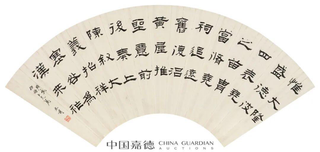 民国十二年(1923)秋,西泠印社组织了一次规模空前的金石家书画展,征得自元赵孟頫至清末赵之谦等一百五十几位金石书画家书画作品两百多件,其全面性足以“徵元明清三代书法画法之变”。本着“私家独赏不若公诸同好”的理念,吴隐的儿子吴幼潜经过一年的编撰,将这次展览的作品以当时最好的西洋摄影制版结集为《金石家书画集》。丁仁在为书作序时写了这么一段话:金石之学,宋元以降,有清最盛。其所著录,上穷周秦,远及海东,殚心汲古,发潜显幽,金石家者流,负艺林重望者久矣。闲情所寄,或书或画,皆有奇气。而其名有彰有不彰,寸缣尺素之所传,致足珍惜。一句“闲情所寄,或书或画,皆有奇气”道出了金石家作品的最大特色,也是其人其作素负艺林重望的重要原因,因此,不管他们的名气大还是小,寸缣尺素都足以令人倍感珍惜。与前人心之所寄颇为相契的是,“竹韵轩”一直以来也都以金石家作品作为收藏重点,无论篆刻、书画或者碑帖信札都兼收并蓄,期望以此建立起一个以名家名品、名人佳作为核心的金石书画收藏体系。此次所呈现的“竹韵轩藏金石家书画作品”专题即来自于此。本专题包括奚冈、赵之琛、吴让之、胡澍、罗振玉、胡柏年、王震、吴藏龛、萧退庵等十来位清中期至民国著名金石家书画作品,其形式含括对联、条幅和扇面等,虽不以规模取胜,然足称各有千秋,可谓文气和奇气并具。以下择其要者稍作介绍。“西泠八家”中有奚冈的《枯木竹石图》和赵之琛的《隶书临汉灵台碑》。奚冈(1746-1803)是“西泠前四家”之一,字铁生,别号有鹤渚生、蒙泉外史、蒙道士、奚道士、散木居士、冬花庵主等。除了篆刻家的身份,他还是当时最重要的画家之一,山水、花卉、人物无一不精,风格淳厚古逸。《枯木竹石图》作于乾隆壬子年(1792)夏,为其47岁仿元人吴镇的作品,勾勒、点染、皴擦均洒脱奔放,用笔具有明显的书法韵味,所谓“诗骨瘦来寒有态”,意境殊为苍茫。由签条上毓东的题字可知,此帧似乎为奚冈送其先人、后由毓东送与徐乃昌(随葊主人)者。赵之琛(1781-1852)是“西泠后四家”的之一,“浙派”篆刻的集大成者。《灵台碑》立于汉建宁五年(172年),传世拓本虽是宋人翻刻,然却是清代金石家们经常临习的隶书名碑之一,黄易、陈曼生、赵之琛、钱泳、赵之谦、徐三庚等都有不少临作传世。此帧赵之琛所临《灵台碑》扇面用笔细腻精到,气息古雅静美,虽云临摹,却带着特殊的个人风格,是一件标准的赵氏隶书作品。Lot 4875