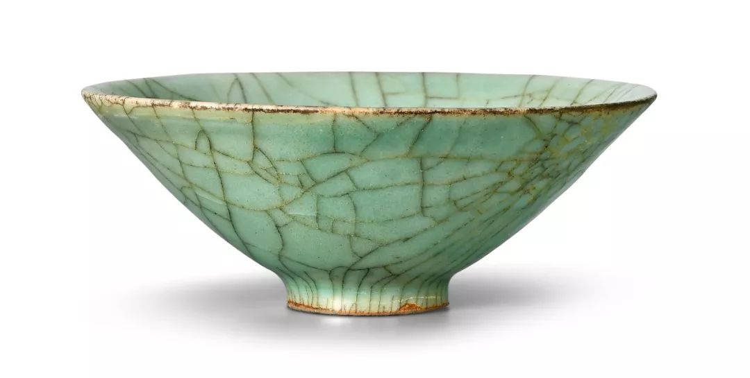 关于南宋官窑的记述,叶寘《坦斋笔衡》中有相关记载:“政和间,京师自置窑烧造,名曰官窑,中兴渡江,有邵成章提举后苑,号邵局,袭故京遗制置窑于修内司,造青器,名内窑,澄泥为范,极其精制,釉色莹沏,为世所珍,后郊坛下别立新窑,比旧窑大不侔矣。”南宋初期宋金战乱,无力建置官窑,只好委于地缘便利且有贡瓷烧制历史的越州烧制。此时,同属越窑系的龙泉窑烧造技术飞速发展,也承担着部分烧制御瓷的职责。因此同具“官窑”性质的两大窑场,便存在某种千丝万缕的联系。作为“官搭民烧”的龙泉窑,自然会对正统的官窑产品进行一定的借鉴与仿烧,以满足皇室的审美与需求。本品即是一例龙泉仿官佳作,其胎壁匀薄,形如斗笠,造型轻灵简素。罩施龙泉青釉,色泽清雅宜人。口沿薄釉,釉层上布满开片纹理,露出深黑色胎骨,富有天然韵致,兼具龙泉的纯净一色与官窑的古韵天成之美。日本东京国立博物馆和台北故宫博物院各有一只南宋时期龙泉窑烧制的青瓷斗笠盏。国内馆藏极为少见,四川省博物馆藏有一只,可资比较。