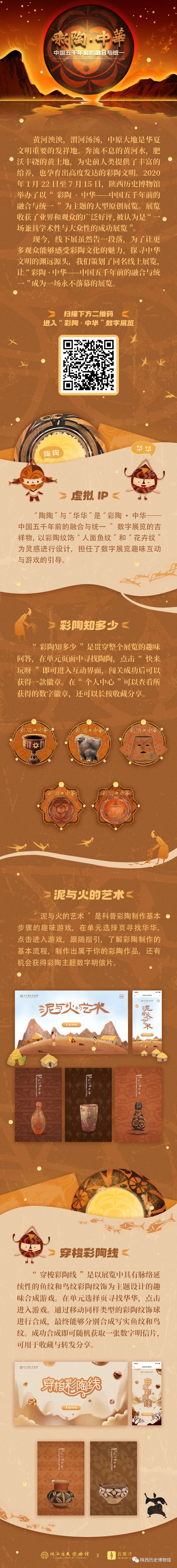 “彩陶·中华——中国五千年前的融合与统一”是由国家文物局、陕西省人民政府主办,陕西历史博物馆承办的大型原创展览,于2020年1月至7月在陕西历史博物馆展出。展览精选了全国36家文博单位的展品,为观众呈现了一场彩陶文化的盛宴。为了让更多观众能够感受彩陶文化的魅力,我们策划了同名线上展览,运用互联网技术进行内容、设计与呈现方式的创新,通过多重赋能,引导观众多角度欣赏彩陶,了解和感悟文物背后的文化故事,使“彩陶·中华——中国五千年前的融合与统一”成为一场永不落幕的展览。线上展览继承线下展主题框架,分为“艺术·源流”“观念·社会”“寻根·中国”三个主要单元。展览包含图片、语音、文字、三维模型、视频等多种展品呈现方式,并增加了互动体验、趣味游戏、数字奖品等功能模块,融通多媒体资源,广泛传播文物,加强文物价值的阐释,进一步推动让文物活起来。“彩陶·中华——中国五千年前的融合与统一”线上展览现正式推出,邀请大家一同畅游彩陶世界,探寻文化根脉。![]()