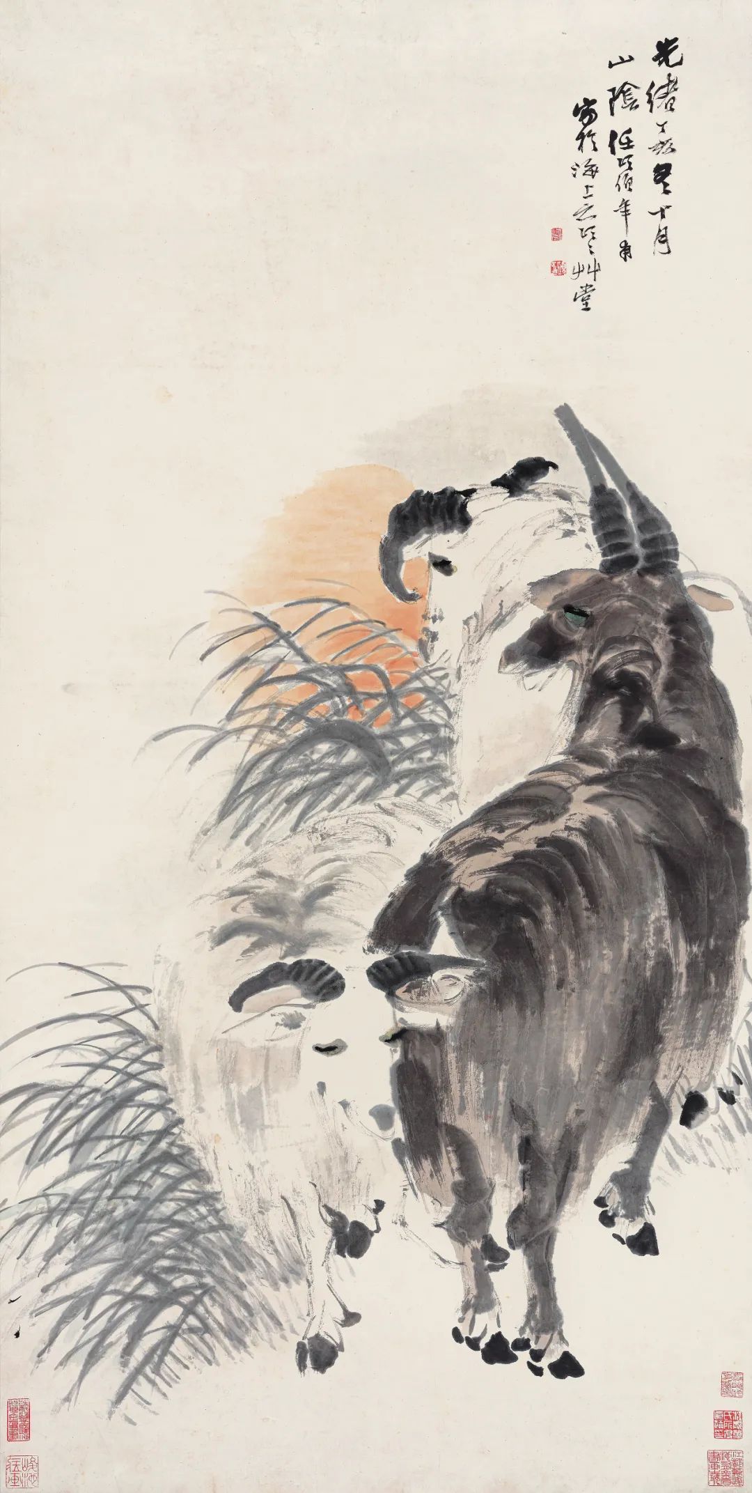 【说明】陈之初旧藏。陈之初(1911-1983),取意「梅花之清香」为斋号「香雪庄主」。祖籍中国广东潮安,少年南渡,创办「长丰」和「隆荣」,经营土产致富,有「胡椒大王」之誉。他自1930年代起收藏逾40年,因财力丰厚,又得画家徐悲鸿等人协助,收藏种类多,数量大,素质高,文房雅器,书画古玩,无不涉猎,均蔚然成家,尤以书画、陶瓷、端砚和印章四类最为突出,其收藏数量庞大,难以估计。在上世纪50至70年代之间,香雪庄被誉为拥有「东南亚最庞大、最珍贵的艺术宝藏」。陈之初通过殷商藏家、百扇斋主黄曼士结识画家徐悲鸿,又经徐悲鸿力荐购藏海派大师任伯年逾百件,曾是海外任伯年作品最大藏家,最为人称道。本幅《三羊开泰》即为其中之佼佼。