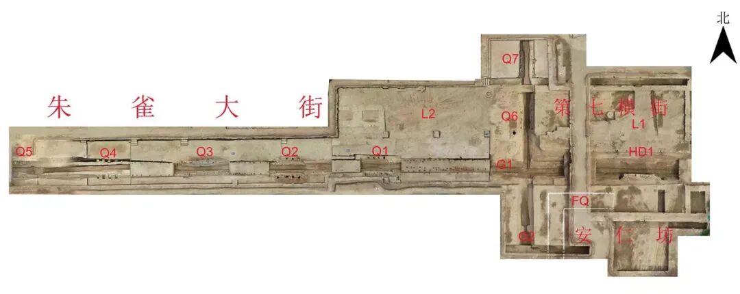朱雀大街五桥并列遗址位于皇城朱雀门外1200多米外,与朱雀门和明德门遥相呼应,体现了都城礼制的最高等级,对于隋唐长安城形制布局及礼仪制度的研究具有重要意义。这是目前经考古发掘出土的我国古代最早的五桥并列遗址,是明清都城中轴线上设置五桥的滥觞,也是中国都城礼制文化起源、传承和发展的实物见证。