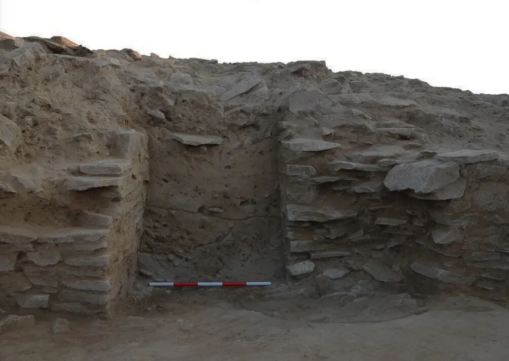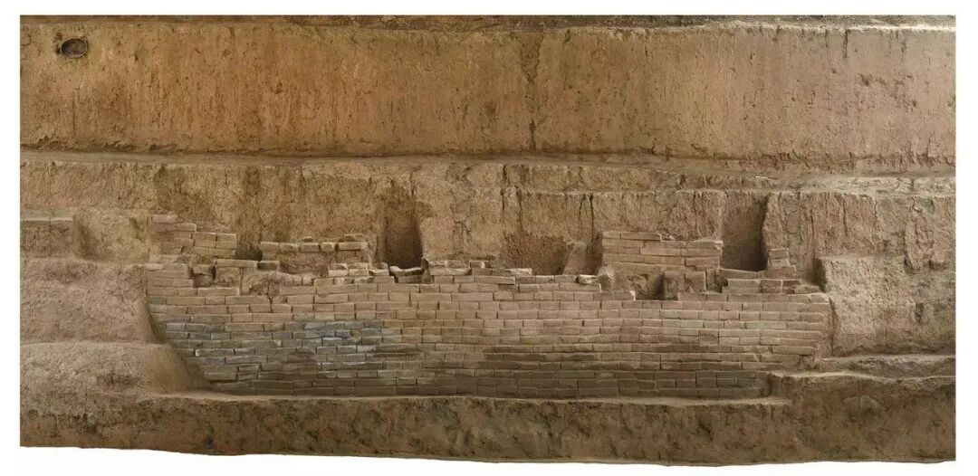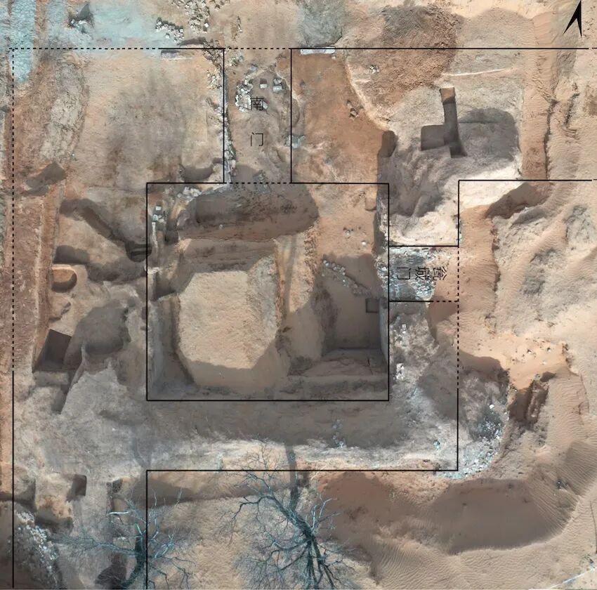 2022年通过勘探,在遗址西侧区域发现夯土城墙、壕沟及道路遗迹,东城墙由两道夯土墙构成,宽度约7米,其东部宽4、西部宽2.7、两者相隔约3米。壕沟宽约8米,残深约2米。对南城墙进行解剖,可确认城墙年代为西周时期,结合勘探已基本确认城址北、东、南三面城墙分布范围,初步判断该城址面积约80万平方米。