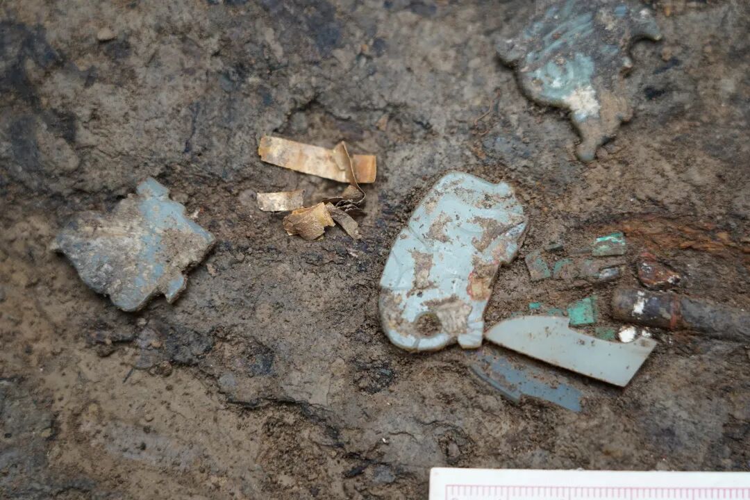 M2墓主盆腔内胎儿碎骨及随葬品出土情况