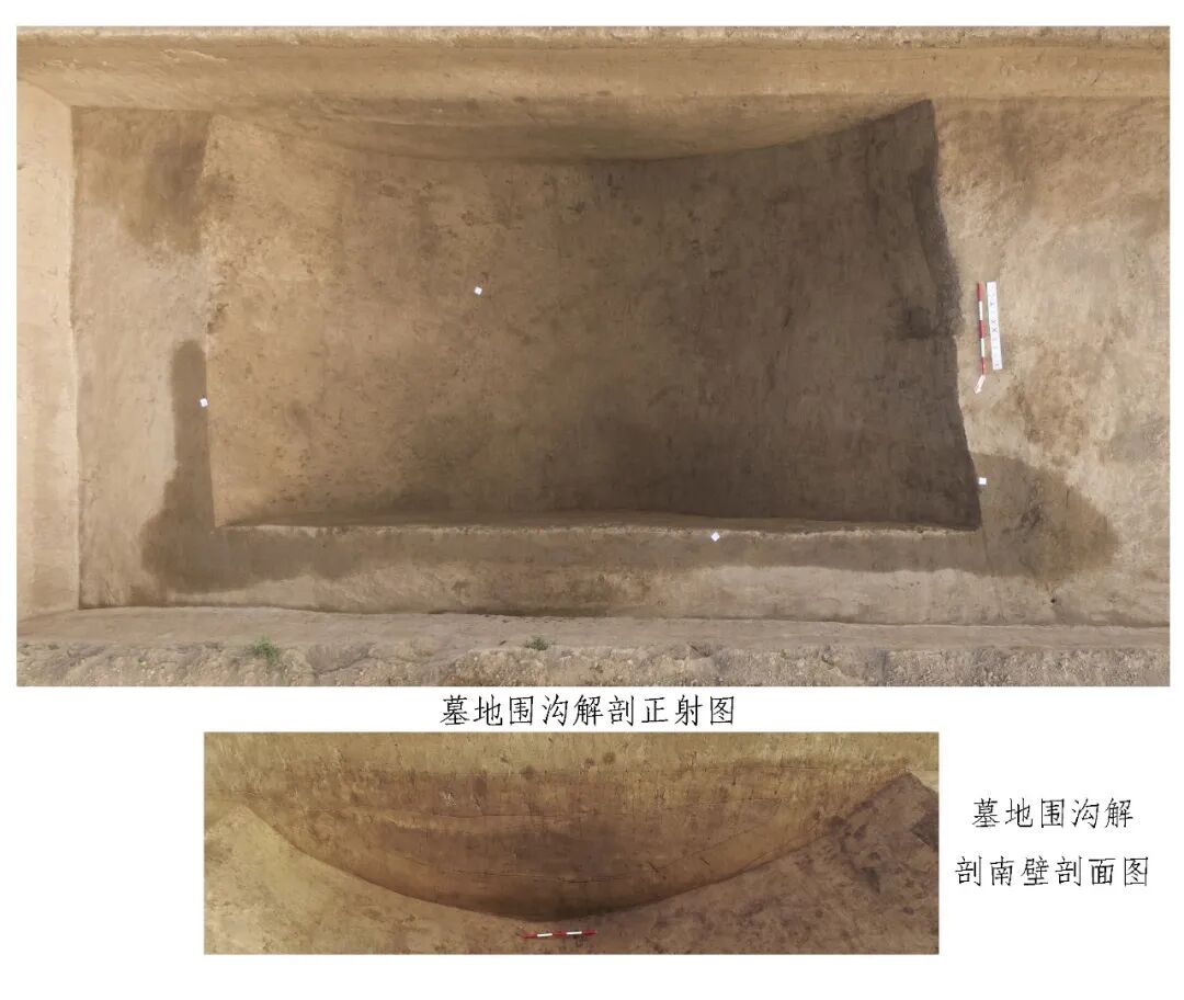 围沟平面呈长方形,东西长233.5米,南北发掘长度256.5米(地块内已发掘部分)。围沟内已发掘217座十六国北朝至唐代墓葬,这批墓葬分布有序排列整齐,有着明显的规划布局,墓道口位置基本一致,墓葬间距基本一致,应为一处有规划的独立的大型墓园。围沟内的墓葬全部为东向,呈南北纵向排列,同一列墓葬大小规模基本一致,根据规模大小可以分为东西两部分。