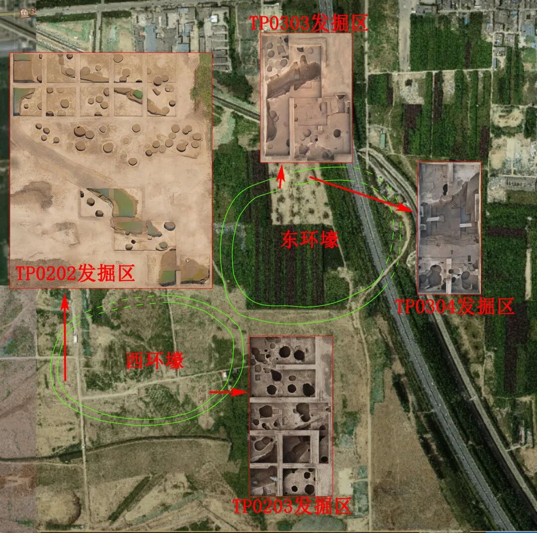 确认这是一处大型的客省庄二期文化聚落遗址,由东西并列的两个环壕构成,遗址面积不小于100万平方米,年代约为距今4150-3700年。两座环壕年代相同,体量接近,口部宽度约15-20米,底部宽度约10米,深约5米。环壕大部分在生土上开挖修建而成,边界明显,保存完好,起到防御、防洪、排涝及满足日常生活给排水的重要作用。