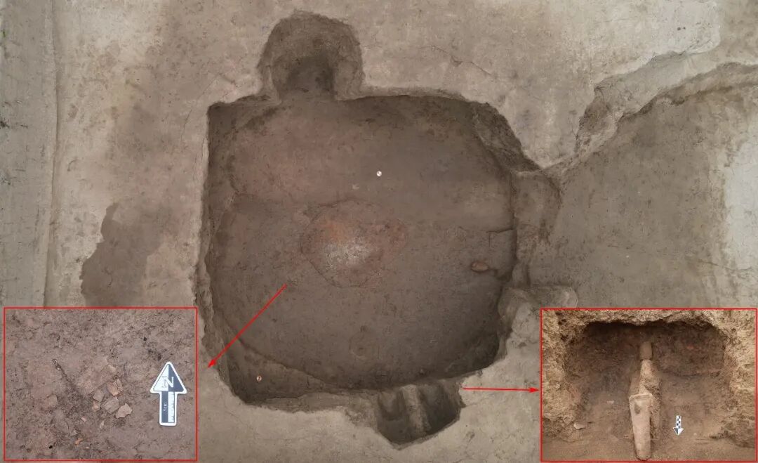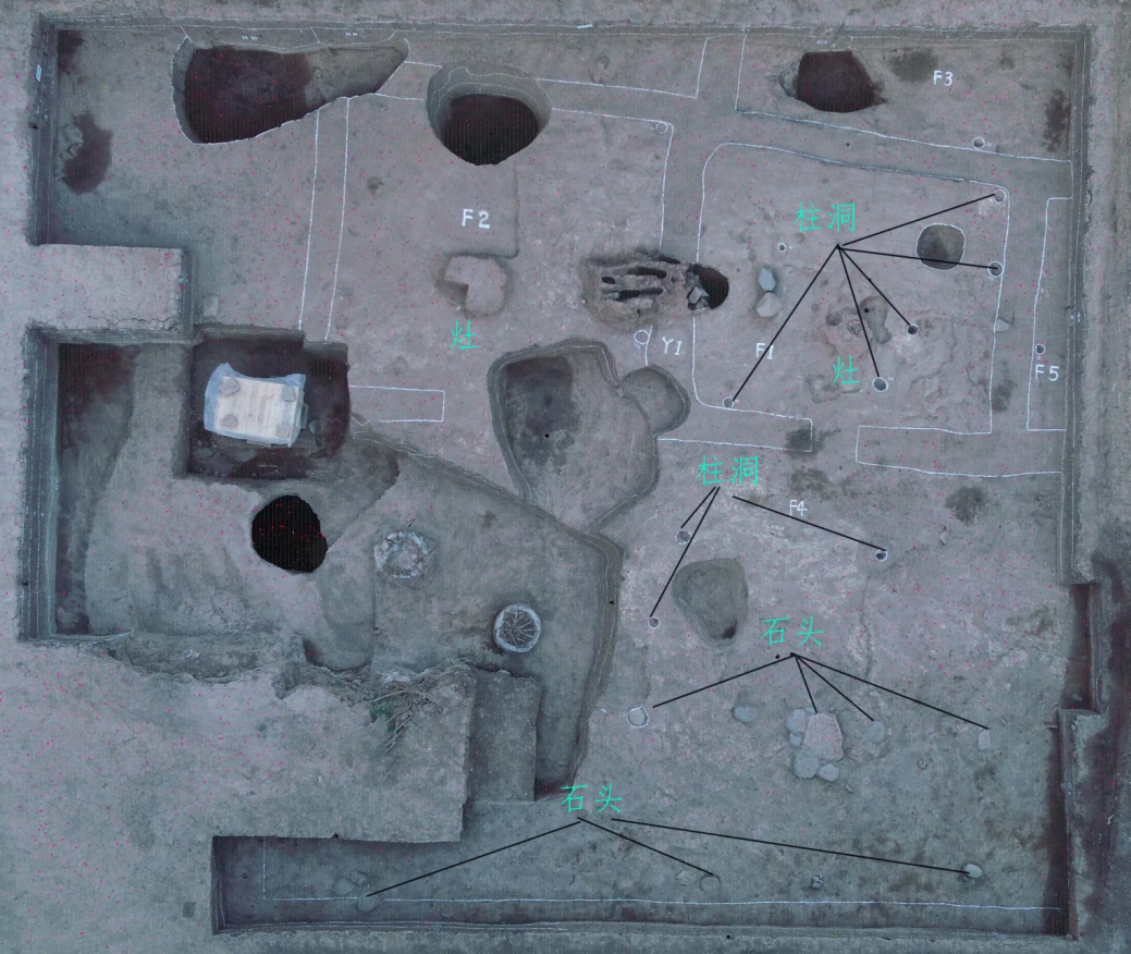遗址内发现居住建筑形式多样。除2021年度发现的地面式方形建筑、“吕”字形半地穴建筑,圆形深穴式建筑外,2022年度新发现有使用土坯的窑洞式建筑,两个居室与一个院落的半地穴建筑组合,及一处可能与建筑相关的人工夯土台基等。编号F9的房址遗存为一处包含两个圆角方形的侧室及及一个椭圆形院落的半地穴院落建筑,院落平面形状为椭圆形,壁面较光滑、陡直,部分墙壁有泥抹痕迹,底部平坦,有不连续的少量白灰面。东南部有两级生土踏步,应为院落出入口。后室平面形状为方形,门道向东,有三级生土踏步。房间中部有一处火烧圆形灶面,西南部有一较完整的龟甲,房间内还发现有三件红陶柱状陶器。侧室平面近方形,门道向南,房间中部有一曲尺形烧土范围,中部有一处椭圆形火种坑。