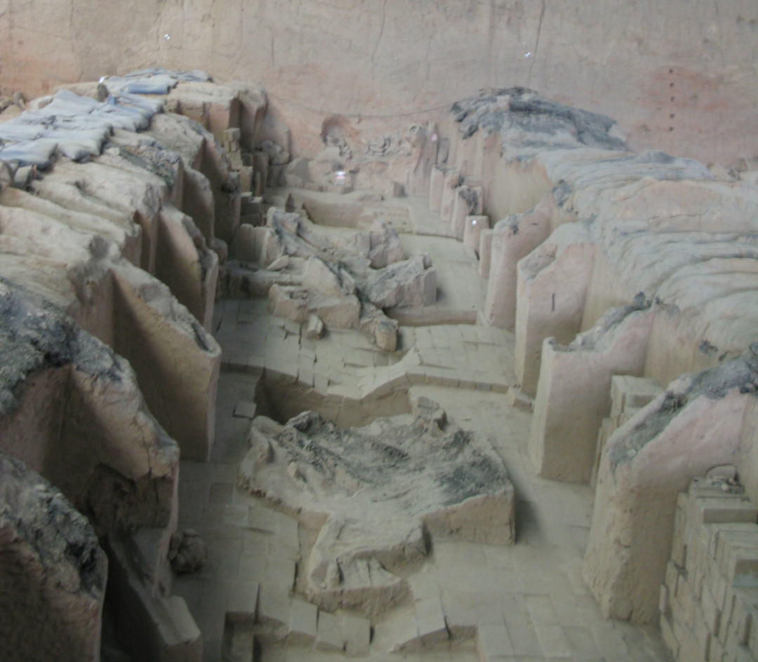 在俑坑建筑结构:俑坑的木质结构是由地栿——立柱——枋木——棚木构成框架式结构,较其他陪葬坑由垫木——地板——立柱——厢板木——棚板木所构成的厢椁式显得技术原始,兵马俑陪葬坑应该是陵园中修建较早的一组陪葬坑。