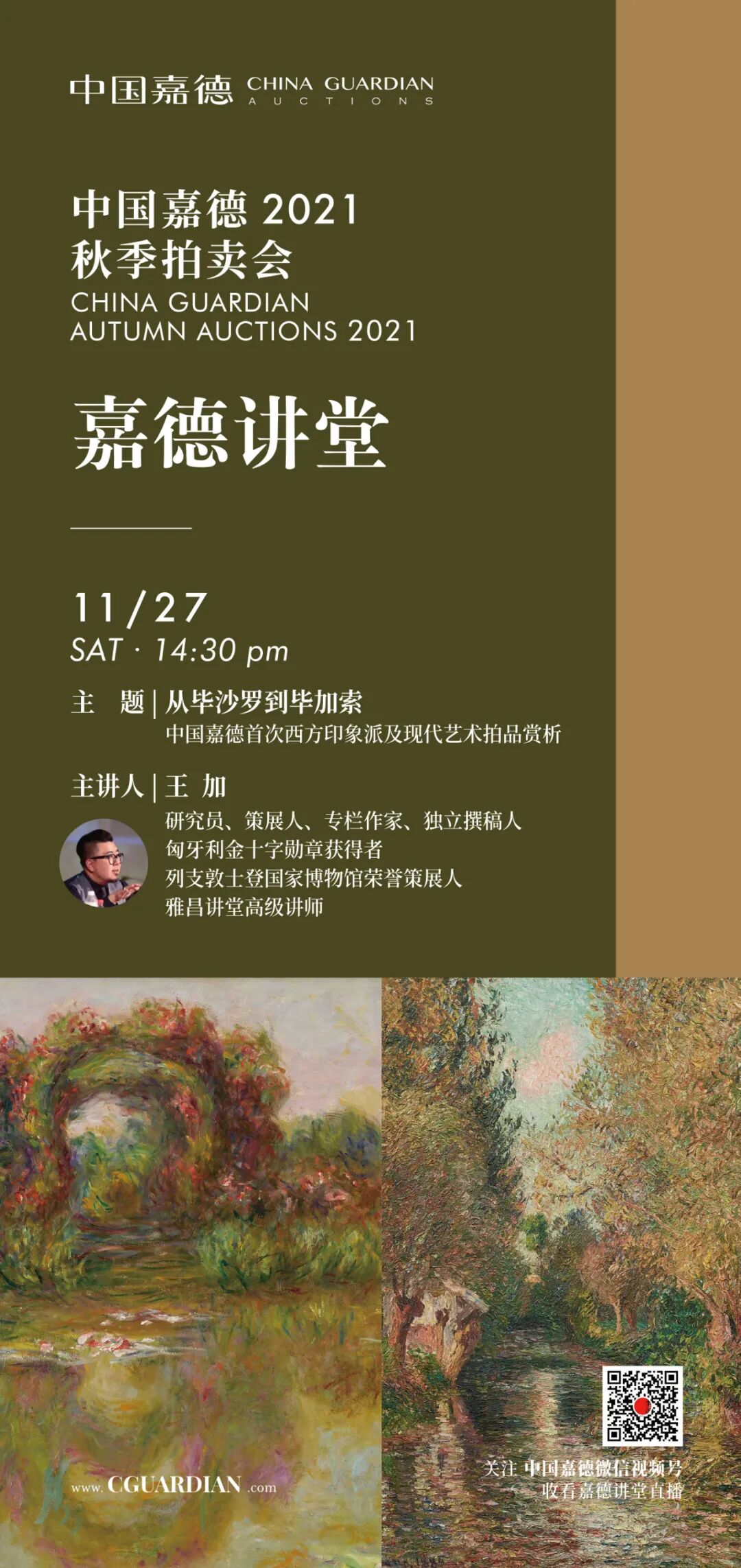 在本次嘉德讲堂中,研究员王加先生将在浅谈上述四位大师的绘画风格、艺术流派及相互关系的基础上,为前来观看预展的藏家及艺术爱好者们详解即将上拍的五幅西方油画名作。曾先后就职于国家大剧院和国家博物馆。自2016年起受邀参与由教育部主办,由北京大学和智慧树网联合打造的《世界著名博物馆艺术经典》系列讲座于2018年被评为“国家精品在线开放课程”。同期在北京画院开设《世界博物馆艺术经典》系列公共讲座。现为香港《大公报》和《大匠之门》杂志撰写专栏;不定期受邀为《北京青年报》、《人民日报》等报刊提供展评和艺评。著有《画外有音》、《音画之间》、《艺·境-王加欧洲游记》并于2013年举办同名个展。