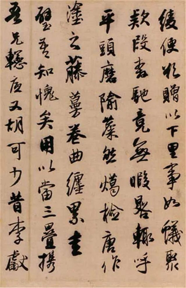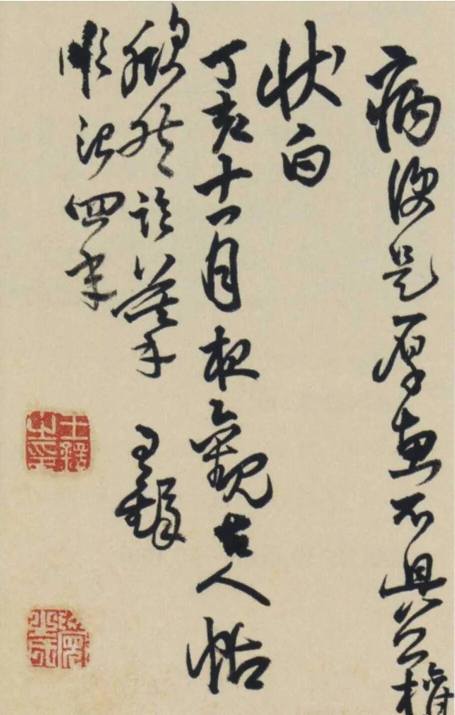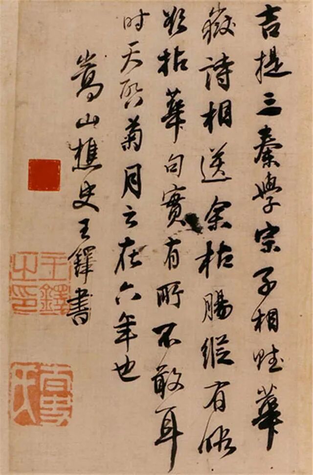 钱长玉年兄督学三辅得得绫便欲赠,以下里事如蚁聚,款段奔驰,竟无暇晷,辄呼平头磨隃糜然,葛(加口旁)检唐作涂之,藤蔓卷曲,缠累圭璧,吾知愧矣。用以当三叠携。吾兄幰虚又胡可少昔李献吉提三秦学宗子相赋华岳诗相送,余枯肠纵有,□欲拈华句,实有所不敢耳。时天启菊月之在六年也 崇山樵史王铎书