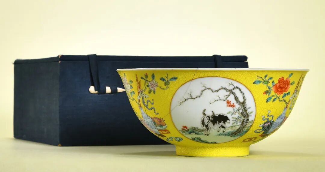 清嘉庆 黄地轧道粉彩开光三阳开泰纹膳碗