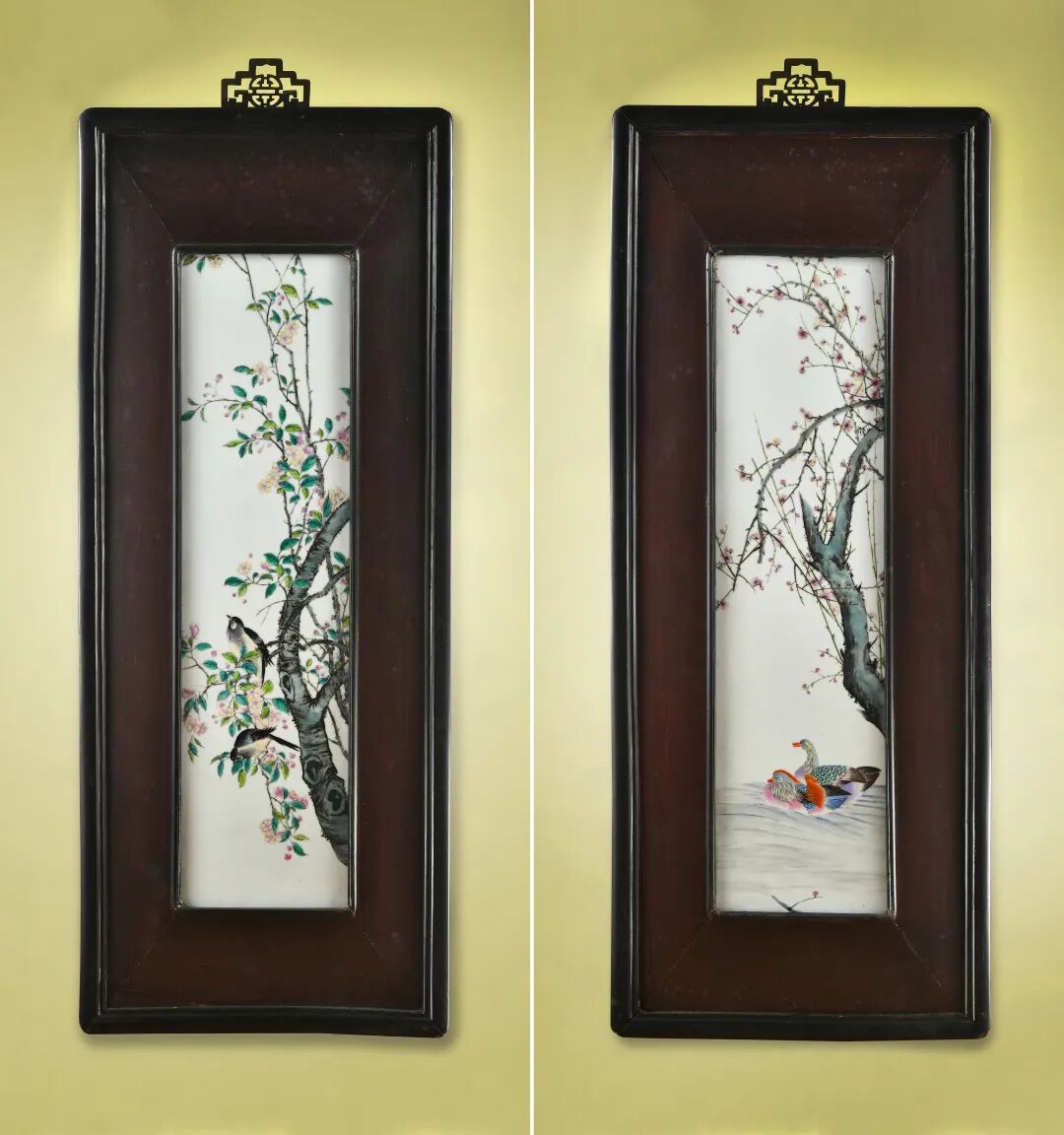 此对瓷板春意盎然。在清代,人们注重居室装潢,大量瓷板被用作插屏、挂屏、家具镶嵌,粉彩、青花应有尽有,雕刻、拱花也各尽能势。但由于工艺难度大,烧制过程中极易变形,故如本品式样的大尺寸的瓷板传世稀少。而此物画意吉祥,一幅绘梅花怒放下两只鸳鸯在水中戏游,一昂首向天,一半缩颈养神,羽分五色,形态生动。另一幅自下而上则承以一树老梅,粗干顶部更溢出画外,更有一对喜鹊,高栖树干,俯仰眉妩向人好。整体笔法灵动,用色鲜艳但不失雅丽,弥漫着文人赏春的浪漫意蕴。