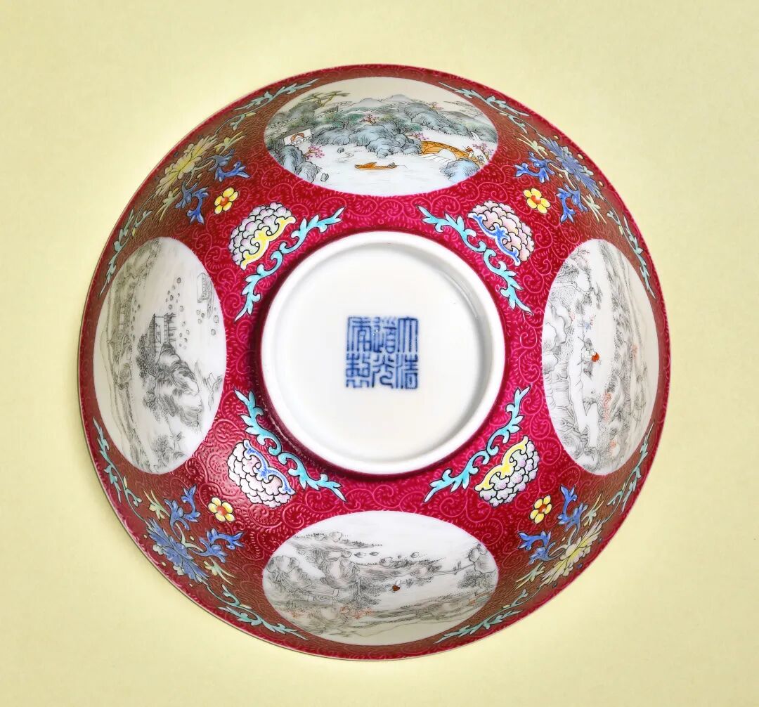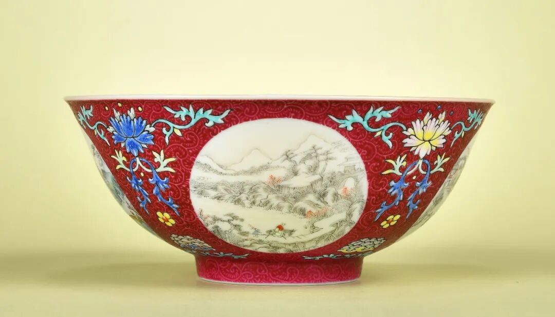 此式碗肇始于乾隆初年,主要烧造于乾隆六年至八年之间,嘉庆、道光二朝继之。据乾隆朝《造办处活计档》记载,其原始名称为“磁胎洋彩红地团花山水膳碗”,画风具有浓郁的西洋色彩,为典型的清宫洋彩器皿之一,乾隆皇帝对此喜爱非常,配匣列入“乾清宫头等”予以典藏。至道光皇帝,于膳食甚节省,然在食器上便有所讲究。本品延续乾隆朝之式样,然制胎、描画、扎道均极细致工巧,精美不让前朝。