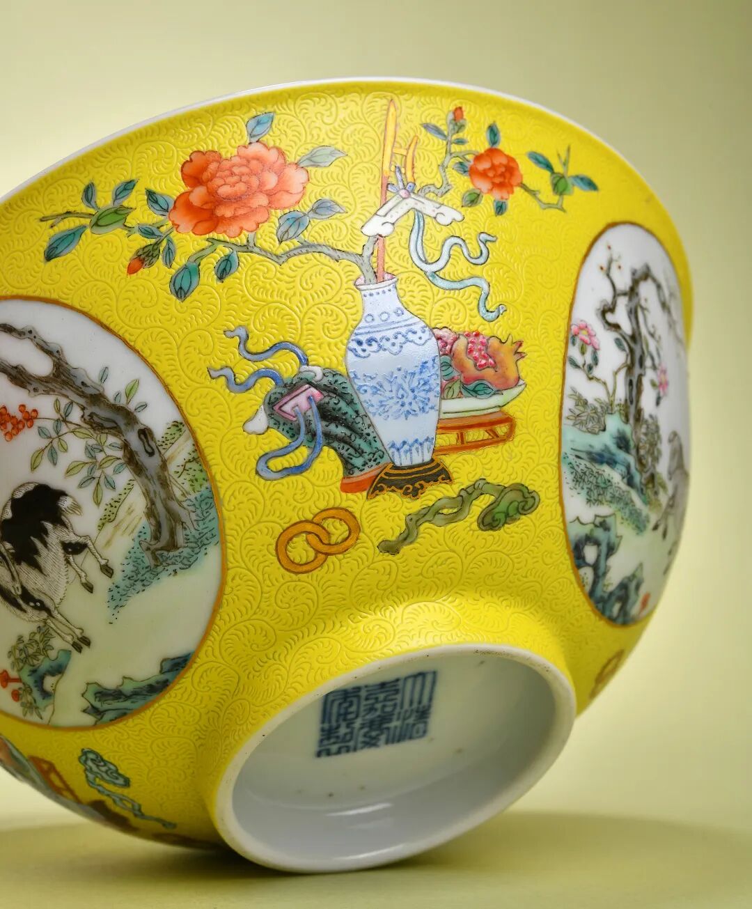 而除开光内三羊之外,碗之四周有花卉图案四组,且配以宝瓶、如意、石榴、佛手、悬磬等物,皆有福寿如意、平安多子的吉祥寓意。