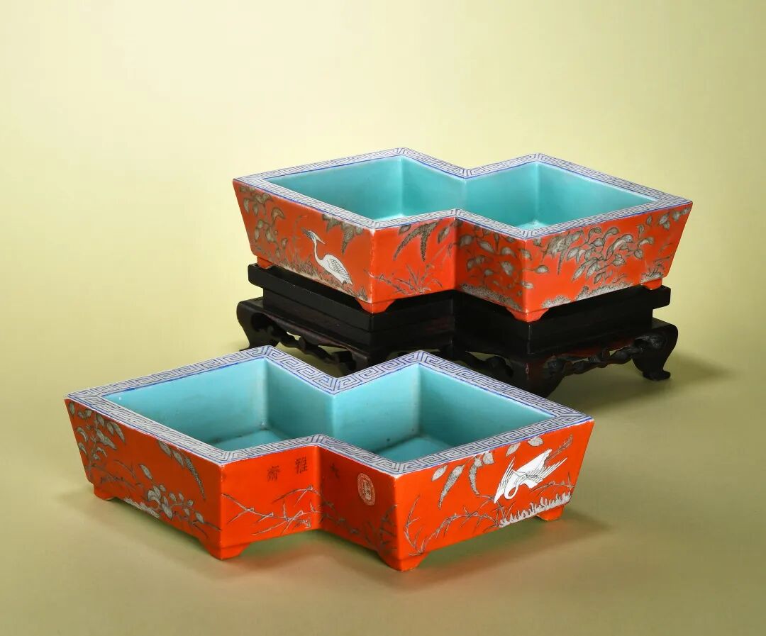 磁臻6的这对水仙盆做方胜形,在同治朝以前,御窑厂并未见到方胜器形的盆器。在色彩方面,大面积使用色地为基色且尤其钟爱墨彩亦是慈禧御瓷的特点。磁臻6之水仙盆,红艳而喜庆,是春节时清宫中一抹迷人的亮丽春光暖色。