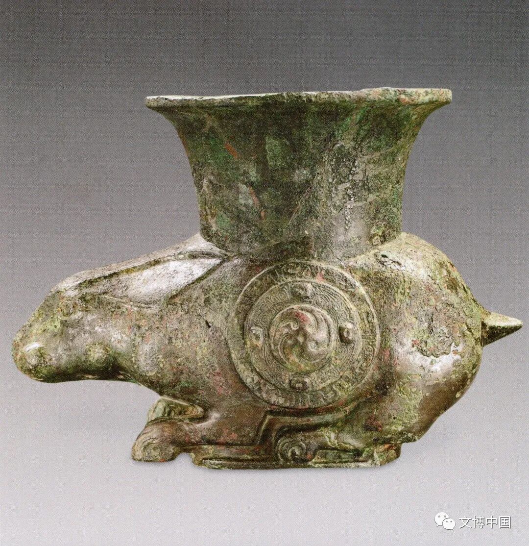 青铜器中所见的兔形文物不多,典型的如山西省曲村县晋侯墓地8号墓出土的青铜兔尊。铜兔头微伸,双目圆睁, 两耳紧贴脊背,四肢弯曲,呈跃跃欲试状,尾巴短小,背上驮一尊口,兔身两侧饰圆形的火纹和雷纹,以兔作为尊的器形,在青铜器中尚属首见(图6)。